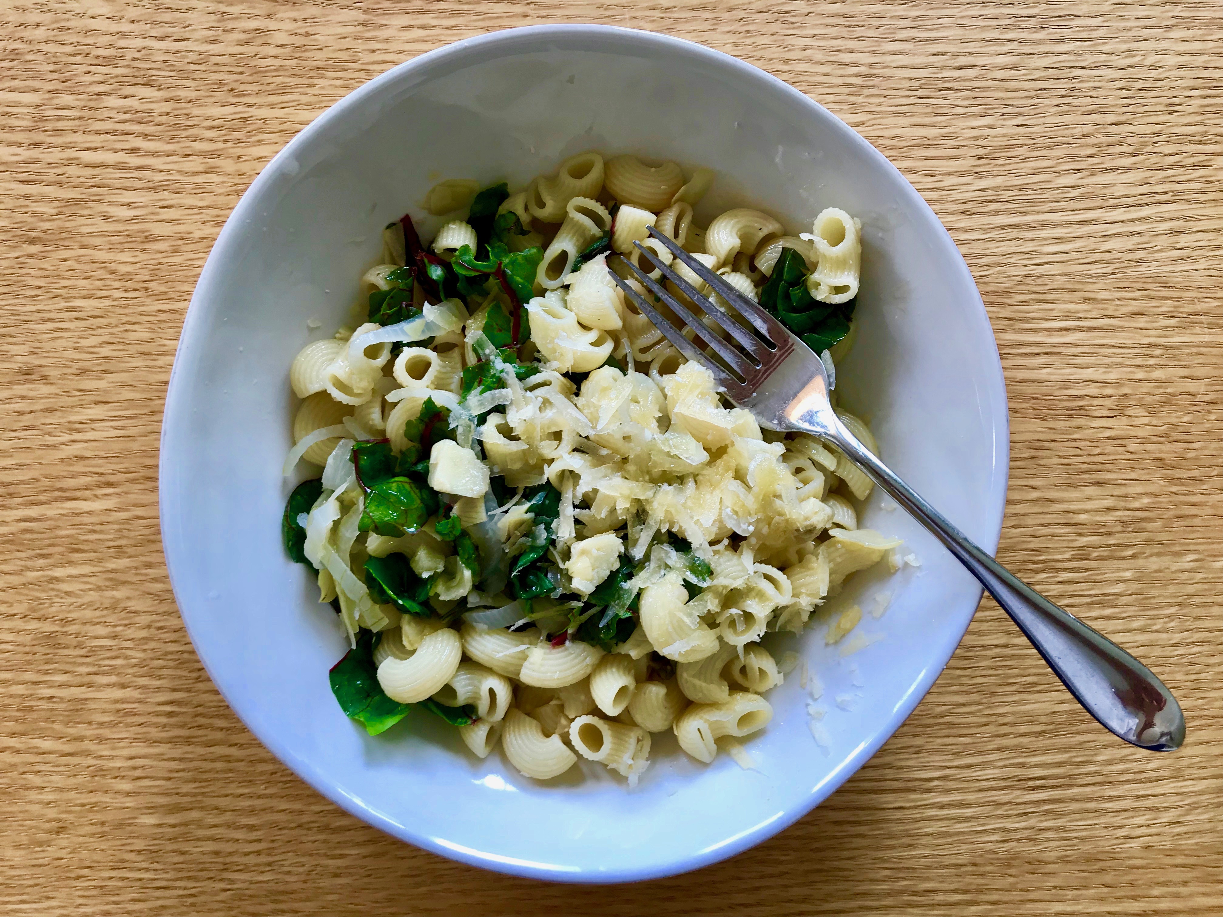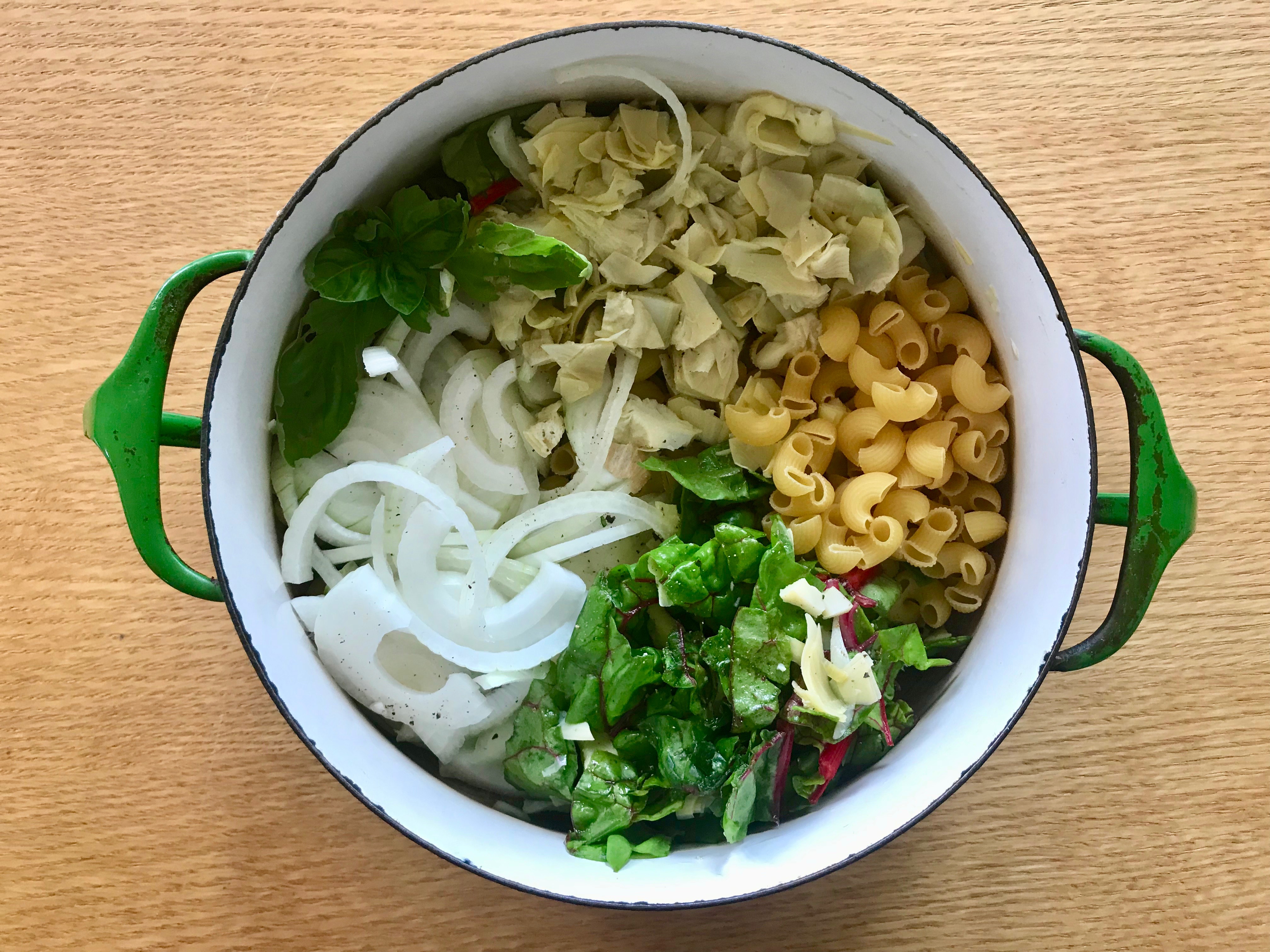 I chose canned artichokes and fresh chard for my main vegetables. If I were making it again, I’d add the chard a little later — after about 8 minutes instead of the called for 10 — because when chard cooks for that long it loses its bright green color. I actually tossed in another handful of chopped chard to the pasta once it was served, and found that the warm pasta was enough to wilt the leaves and preserve the color. I also added butter at that point because: butter.