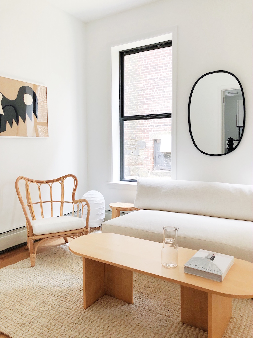 Rattan chair: Ikea. Sofa: CB2. Coffee table: Urban Outfitters, sold out. Side tables: Urban Outfitters, similar. Small lamp, left: Ikea. Floor lamp, right: Urban Outfitters. Mirror: Umbra. Frame: Ikea. Carafe: similar. Rug: World Market.