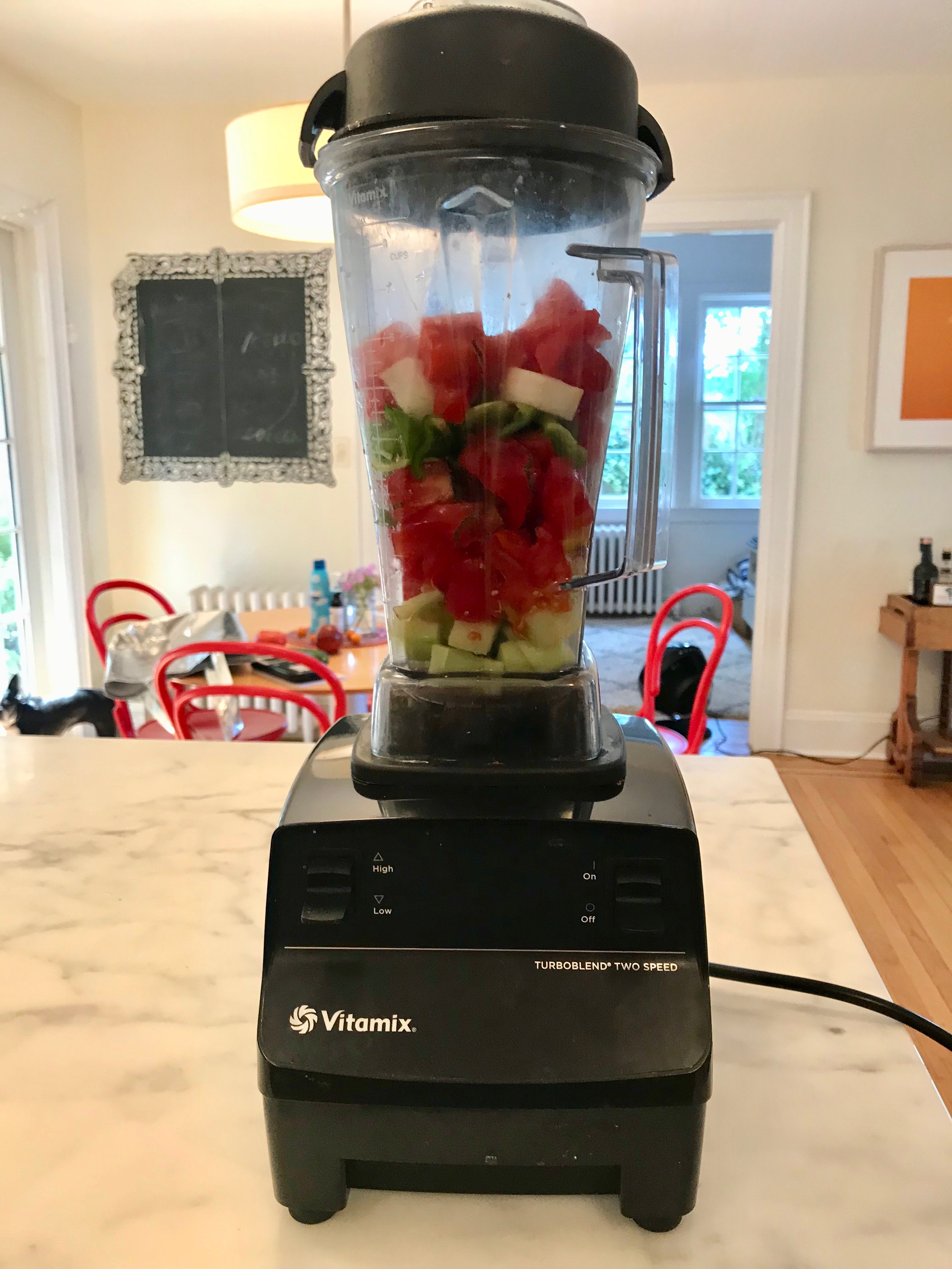 No no no, Lia corrected me. “This one is Seville style — no eggs, and it’s the easiest, most delicious thing in the world.”  You just chuck everything into a blender, pour into a pitcher and chill in the refrigerator. Apparently, in southern Spain, people enjoy their gazpacho by sipping it from drinking glasses, not with a bowl and a spoon. “It saves me in the summer,” Lia said. “I make a pitcher on Sunday, then it’s there all week if I want something quick and refreshing.”