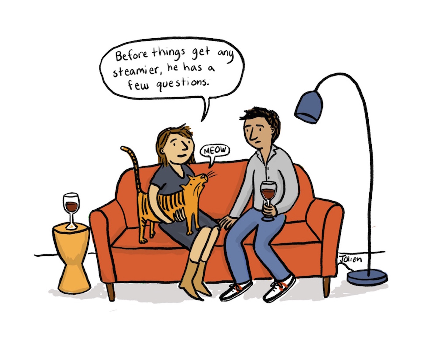I am laugh-crying while reading this comic because it reminds me so much of my dear dog, Sadie and my now-husband. Sadie was very protective of me back in my single days, and I remember telling my husband ahead of our first date that he should be prepared to be barked at, because Sadie didn’t like it when men would come to my house – particularly men she didn’t know. True to form, when Zack came to my door that night to pick me up, Sadie barked her little head off at him. He reached into his pocket and pulled out a dog treat! She sniffed it, ate it in one gulp, and continued to bark and bark, as if to say “I’ll eat your treat, but you still have to answer my questions!” They became best of friends. Yesterday was Sadie’s last day on earth, after a long decline due to old age. My husband and I were tearily reliving some of her best moments last night. I had forgotten this one until I read this comic. I’ll have to show him tonight…