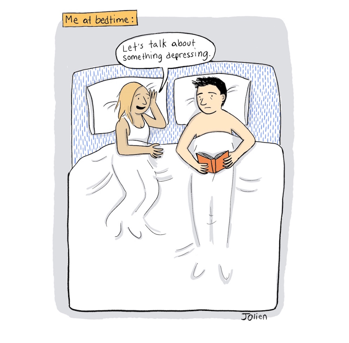 This is totally me. Right as we start to fall asleep…”Isn’t it sad how everyone you love will eventually die one day?” I’m not usually like that, but for some reason all those anxieties come rushing in at bedtime! I remember a CoJ post about that a few months ago, and it made me feel so much better that I wasn’t the only one!