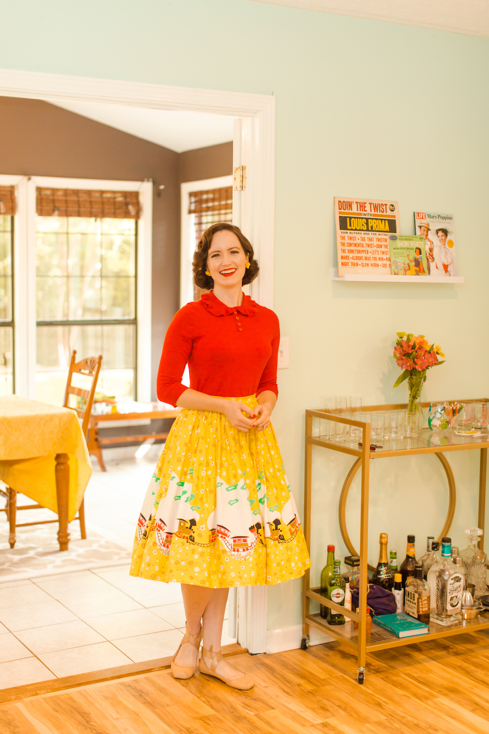 “My style has always been colorful, but in the past few years I’ve started dressing consistently vintage or vintage-inspired. I’ve always loved vintage style. I grew up watching musicals like My Fair Lady, and then in high school I loved Mad Men — especially Betty’s and Joan’s looks. That really helped me home in on the late 50s and early 60s style. A lot of people will say, ‘Does it take forever to get dressed?’ but it’s pretty easy because a dress is just one piece. And most of my shirts match with all of my skirts. This skirt is a favorite because it has art by Mary Blair, the animator and designer who did the concept art for Disney’s Cinderella and Peter Pan, among others. The little kids at school LOVE it.”