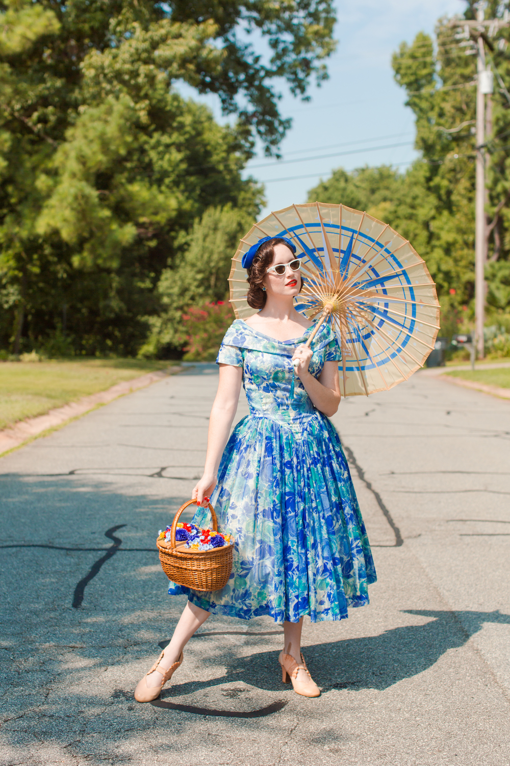 Dress: vintage. Parasol: Dapper Day Shop, similar. Headpiece: vintage. Earrings: vintage. Sunglasses: vintage. Basket: vintage. Shoes: Miss L Fire, similar.