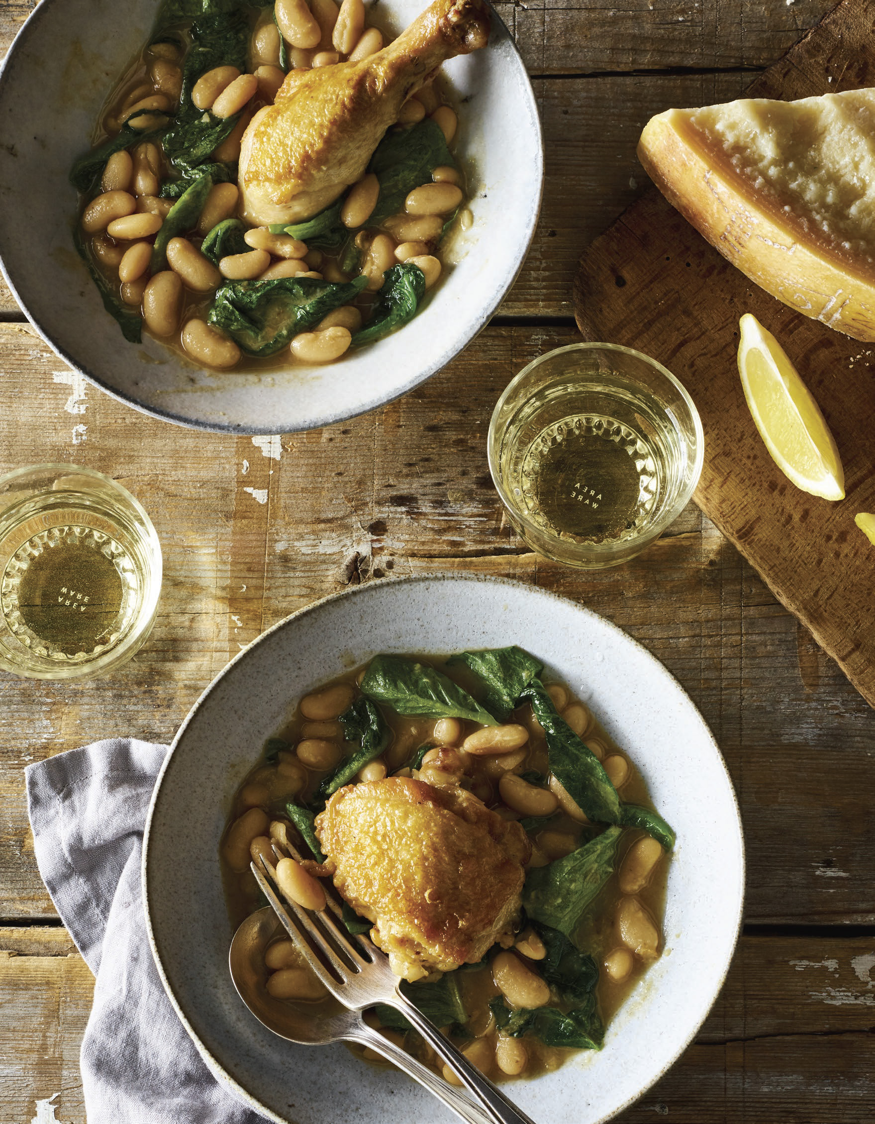 Add the beans and simmer for 10 minutes, or until they look nicely glazed. Increase the heat to medium and add the lettuce. Stir until the lettuce is wilted and the chicken is hot again. To serve, divide the chicken legs into two. Then ladle the stew into bowls, top with a piece of chicken along with some Parmesan and a little drizzle of oil, and serve with lemon wedges.