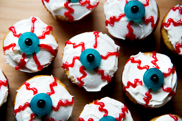 Start with a white cupcake with white frosting. Insert a small black jelly bean into a circular gummy candy (Gummy Lifesavers are perfect here.) “I’d use a believable iris color like blue, green or brown, but I am not the boss of you,” says Clare. Place in the center of cupcake. Using red writing icing (gel or opaque, squiggle some bloodshot veins from the iris. Display in pairs.