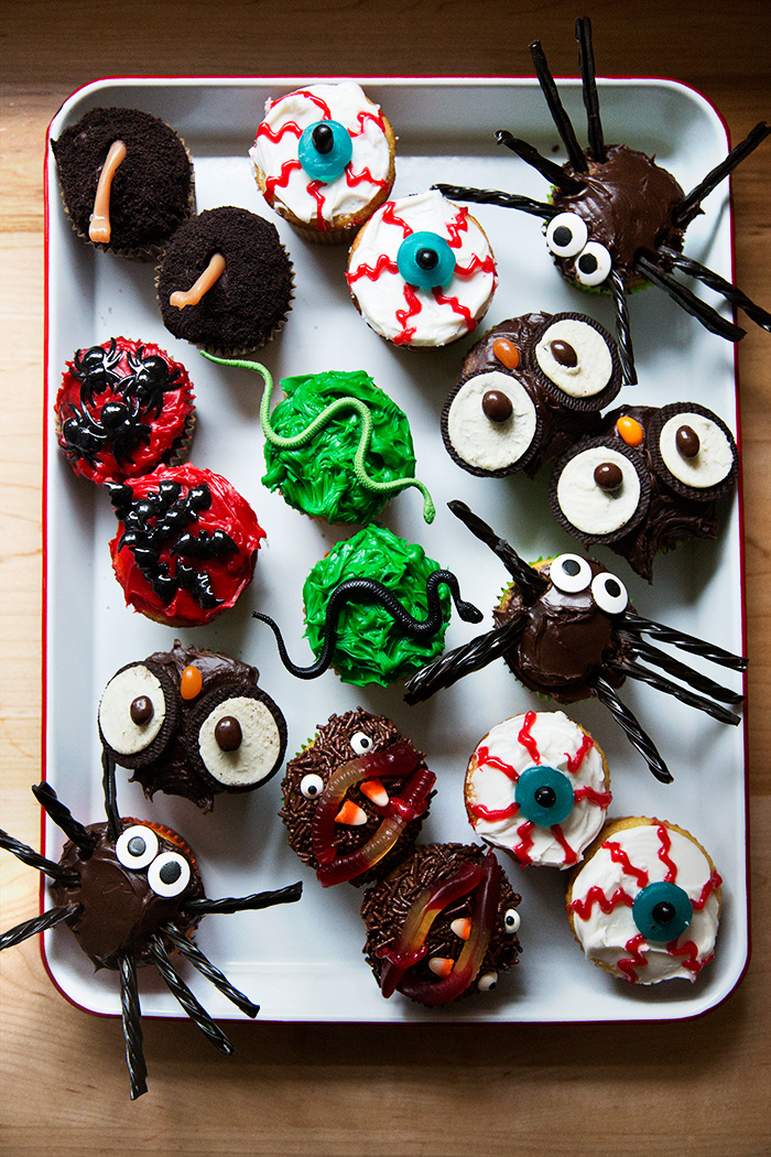 Choose any flavored cupcake with any colored frosting. Clare suggests white, dark chocolate or dark red frosting “for drama.” Cover with candy bees, ants or gummy insects. Decorate each cupcake with too many of whatever you choose.