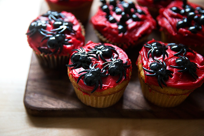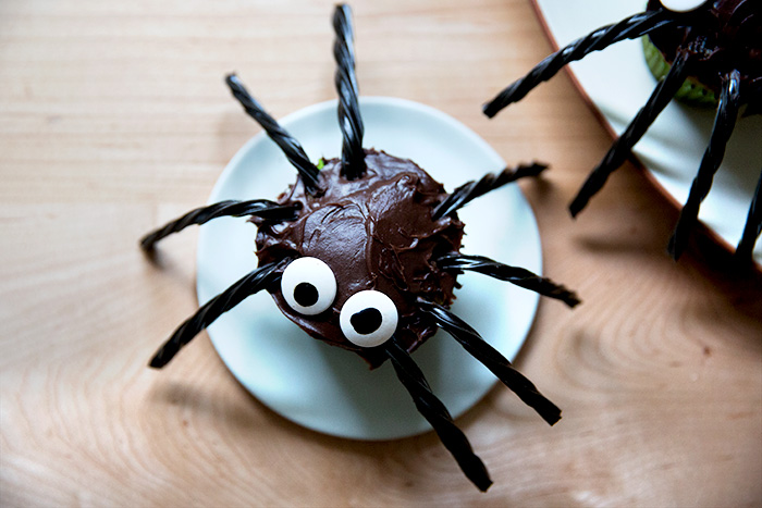 Start with chocolate cupcakes frosted with dark chocolate frosting. Insert eight pieces of black licorice into sides of cupcake for legs. Place two red hots or candy eyes in front of cupcake.
