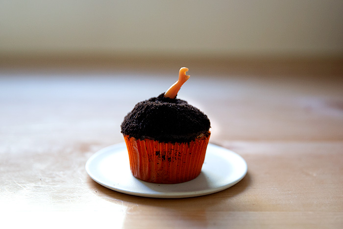 Start with a chocolate cupcake iced with chocolate frosting. Sprinkle some chocolate cookie crumbs on cupcake. (Clare uses Famous Chocolate Wafers for this.) Insert a small plastic doll arm in the center of the cupcake. (If you don’t have extra limbs lying around and still want to take this on, you can find them in most craft stores.) From Clare: “I’ve been criticized for this recipe being ‘too scary’ which I take as the highest Halloween compliment!”