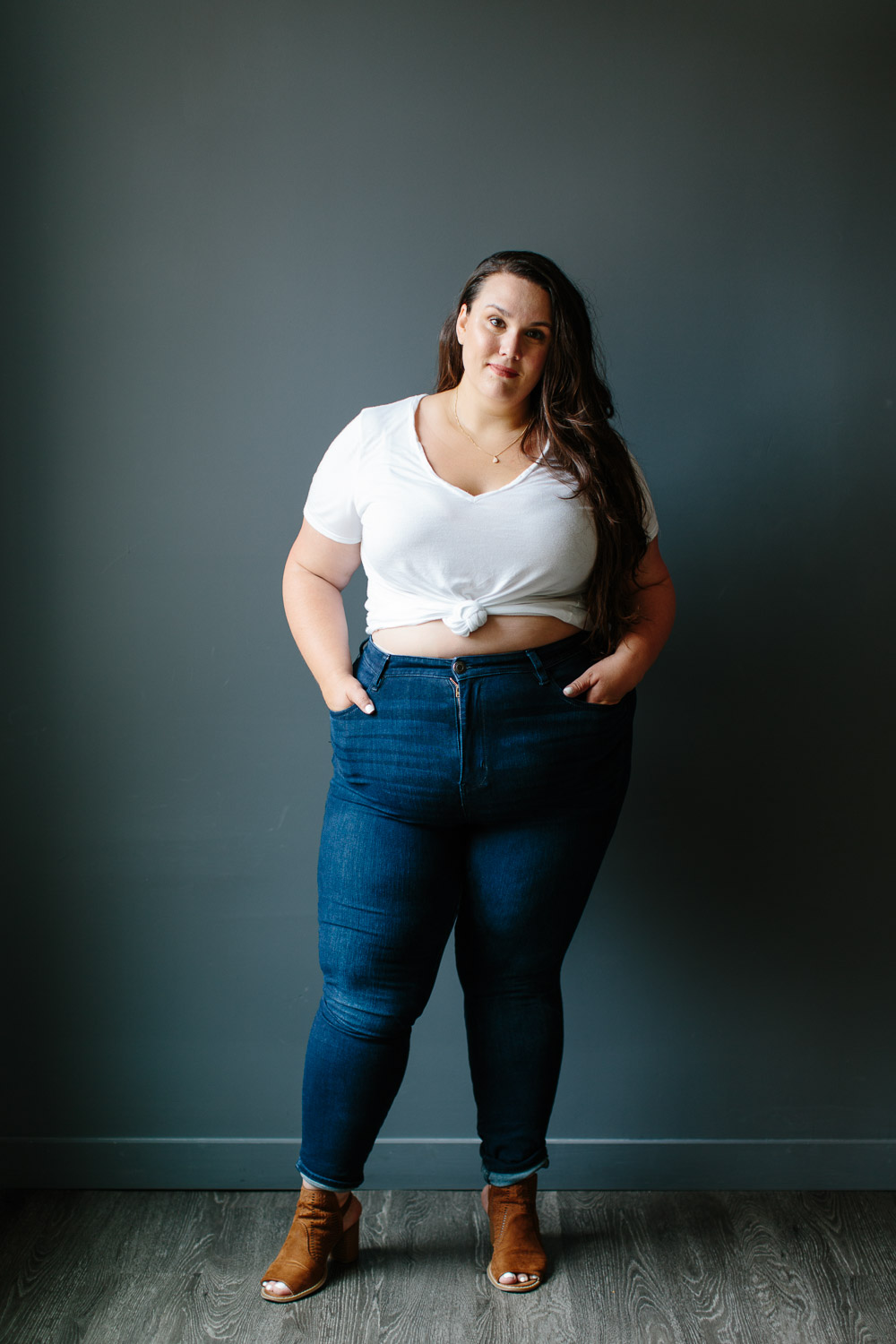 “I’ve been rocking the tied-up tee for a long time. I really like my waist and hips, so this look has always been a part of my style. I love American Eagle high-waisted jeggings, and their Dream Jean (though I really wish they didn’t stop at size 20, so more people could have access to them). I wore them prior to pregnancy, all throughout, and postpartum. A lot of women ask me about plus-size maternity options, since there are so few, and I always tell them just to buy regular plus clothing and size up.”
