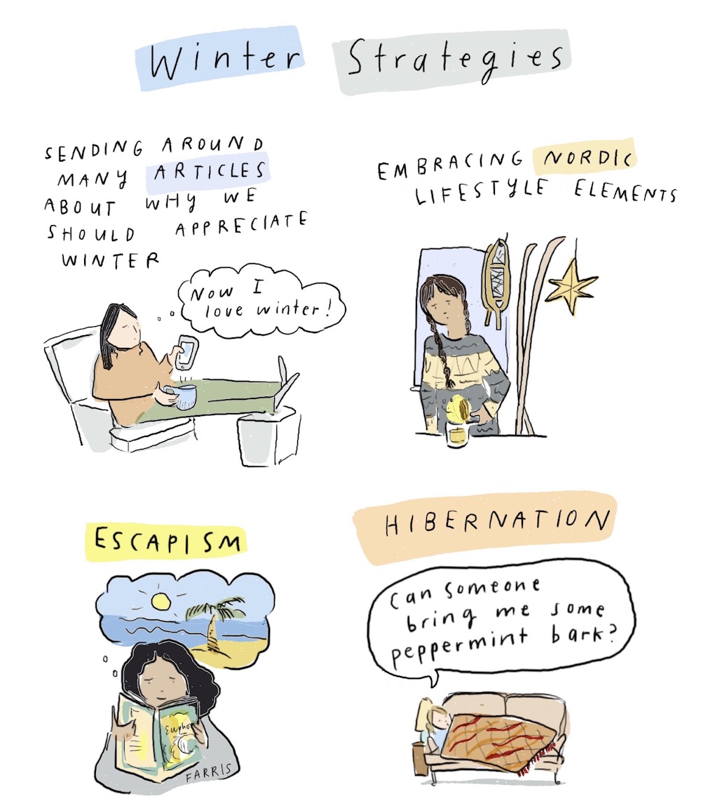 It does make a difference to embrace the season. I live in Minnesota, and one of my favorite times of year is the first weekend of February, when there are several outdoor events around the Twin Cities, now bundled under The Great Northern festival. There are ice castles, hockey tournaments, a luminary loppet, and more. We bundle up and get out all winter long to enjoy the snow and winter exercise, but I also love how cozy things get inside too. Christmas lights are left up into the New Year when days are still very short and dark, neighbors have glogg and dinner parties, breweries stay busy, and several of our favorite restaurants have fireplaces.