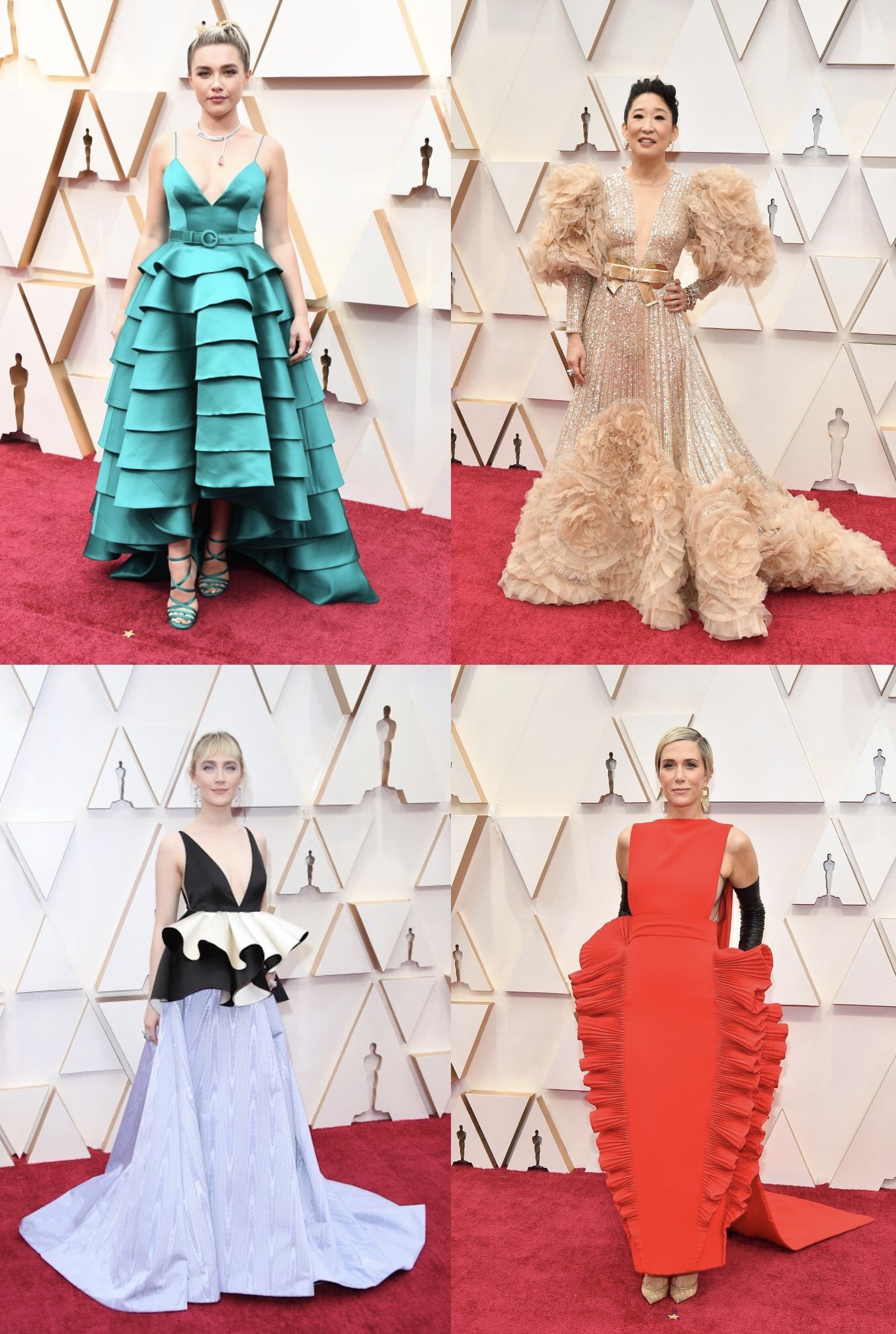 This award is a four-way tie between Florence Pugh (for resembling the sea), Sandra Oh (for resembling mille-feuille), Saoirse Ronan (for resembling an orchid eating a black and white cookie), and Kristen Wiig (for resembling lasagna). Love it or hate it, we salute these women for embracing bold looks.