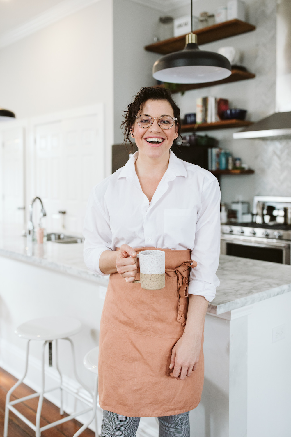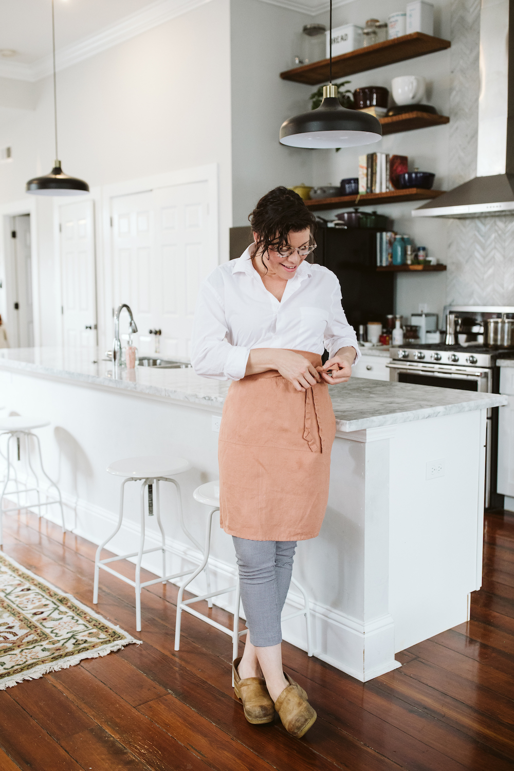 Shirt: Walmart men’s dress shirt, similar. Pants: Polka Pants. Glasses: Krewe. Apron: Not Perfect Linen. Mug: Campfire Studio Maine. Clogs: Dansko.