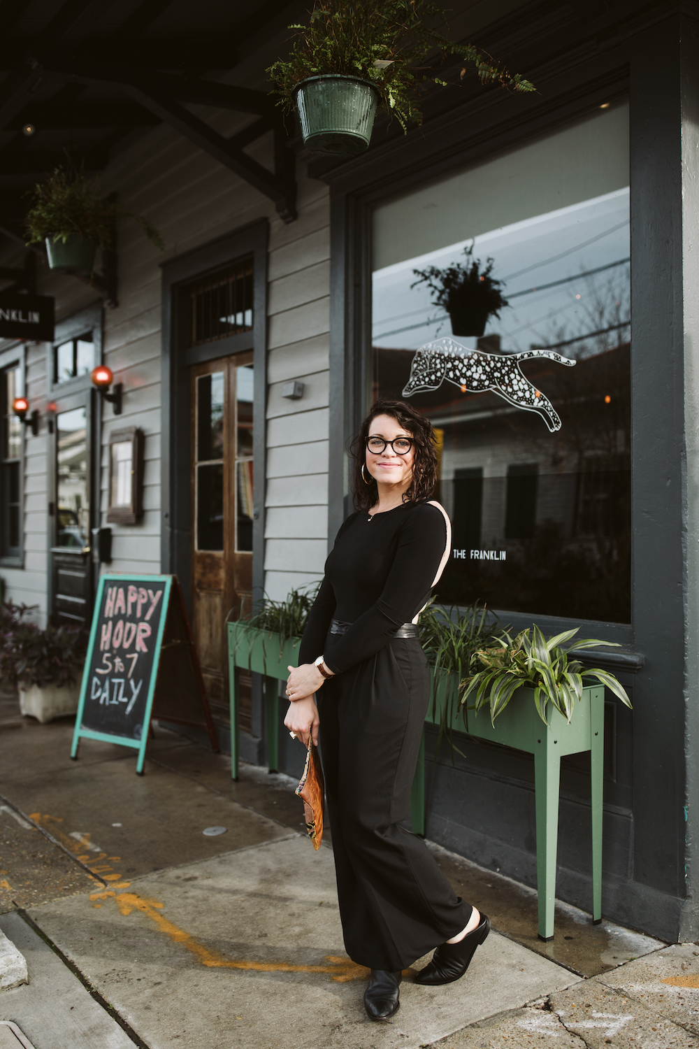 “I don’t wear a ton of black, but when I do it’s all black. This is my date outfit. I love a monochrome moment, and this slinky, backless bodysuit paired with my favorite wide-leg pant is sexy without being over the top. I love going to Commander’s Palace for 25-cent martinis or my favorite restaurant, Thalia. I love the schnitzel and the menu changes every week, so there’s always something fun to try. It’s perfect — the kind of place where they remember your name.”