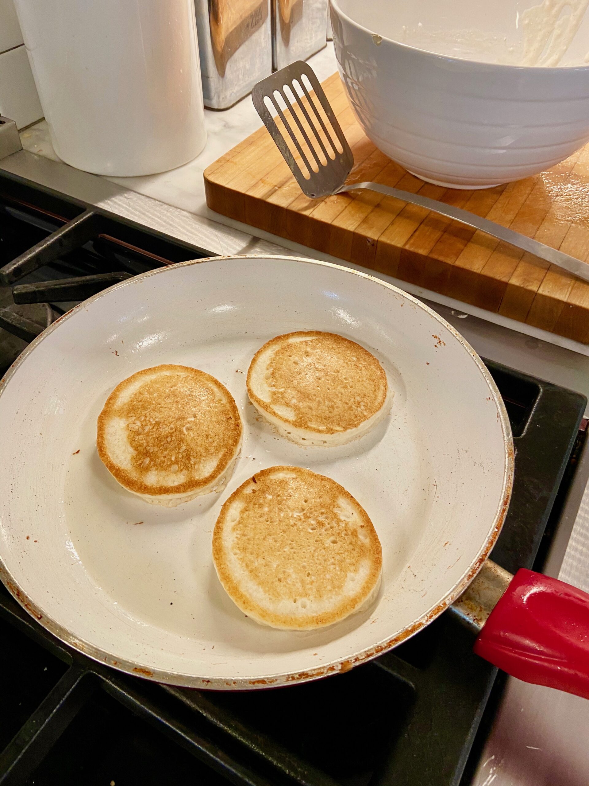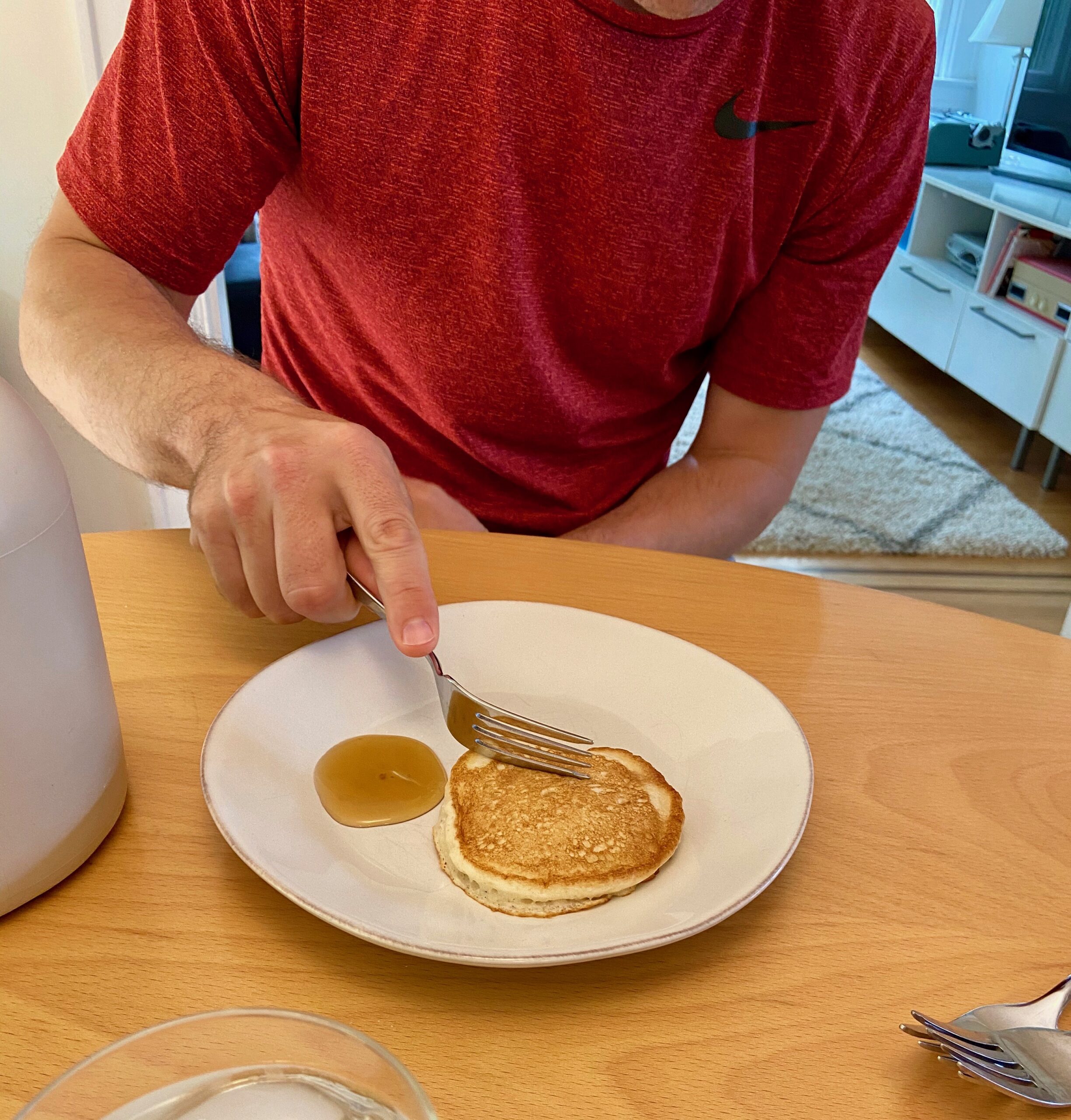 As much as I would’ve loved to invite the entire block over for breakfast, circumstances limited me to just the four residents of my house: me, my husband, Andy, and our two teenager daughters, Phoebe and Abby. As with all of the taste tests we’ve conducted, this one was blind — I made four pancakes per box, then wrapped them in aluminum foil packets; each of those packets were labeled with a number that corresponded to its box and kept warm in a 200°F oven while I fried and flipped my way through all the brands. For serving, in spite of my 16-year-old protesting the absence of Nutella, I made sure each pancake was tasted by each tester the exact same way: dipped in maple syrup. In between bites, they were instructed to sip ice water, while I typed out their reviews sitting across from them at the kitchen table. They were asked to comment on texture, flavor, and fluffiness, and, finally, give each one a grade from one to five, five being the highest.