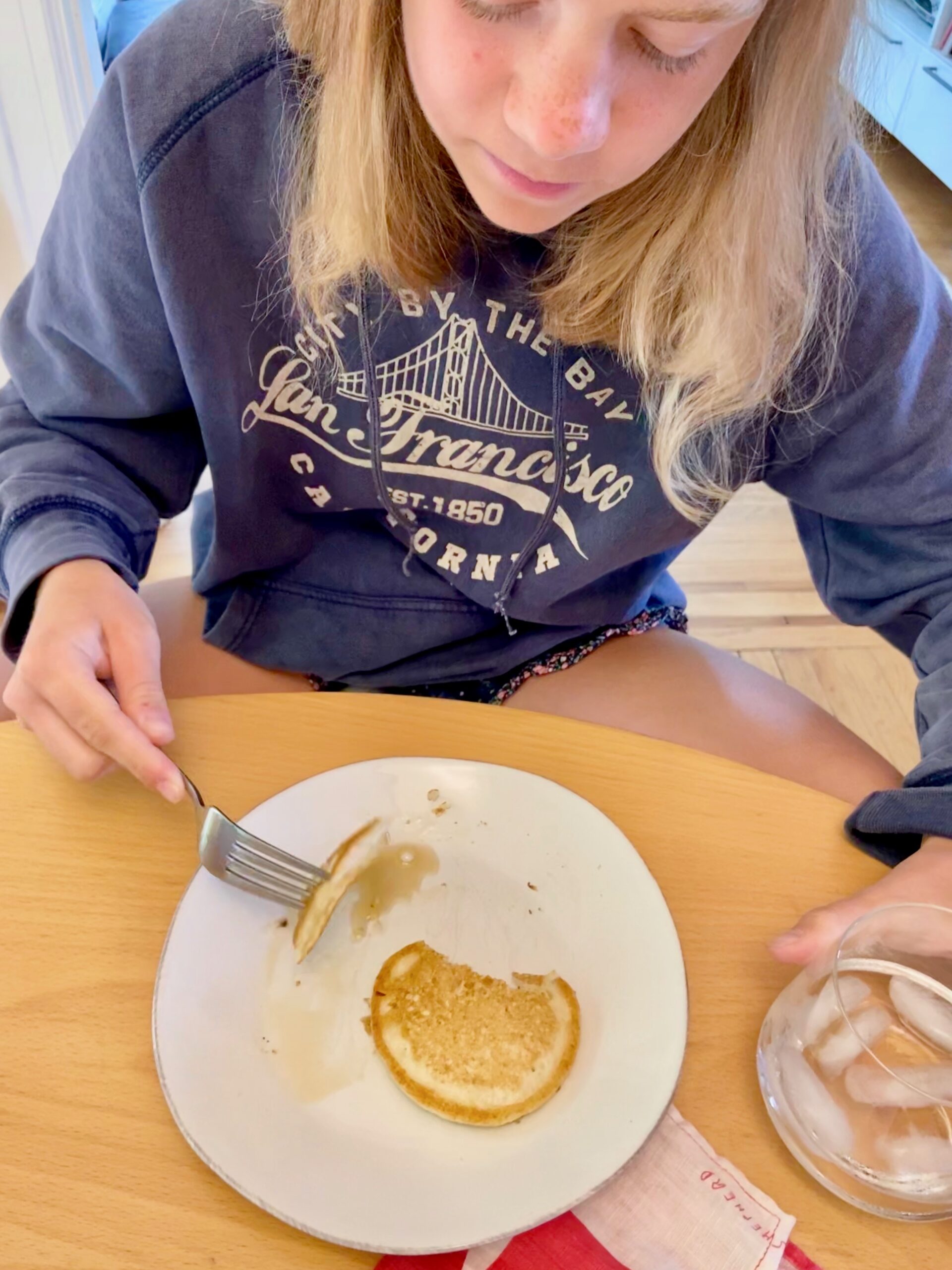 It turned out, my lab rats had a lot to say about a food I thought would’ve had a rather narrow range of descriptive words. Pancake number 2, Hungry Jack, was deemed “pathetic,” “dense,” and “absolutely no fluff whatsoever,” according to Abby. I thought Trader Joe’s, which the girls grew up on, would have some sort of nostalgic advantage, but their reviews ran the gamut from “This is pretty, is it homemade?” to “Eh”  to “tastes like a rubber pancake.” Sadly, the only mix with 100% pronounceable ingredients (King Arthur) garnered the lowest score. But I blame that on the fact that one of those ingredients was white whole wheat flour, which presented a visual barrier (“That looks like a horrible pancake”) that was difficult to overcome. The two brands that scored the highest surprised me…