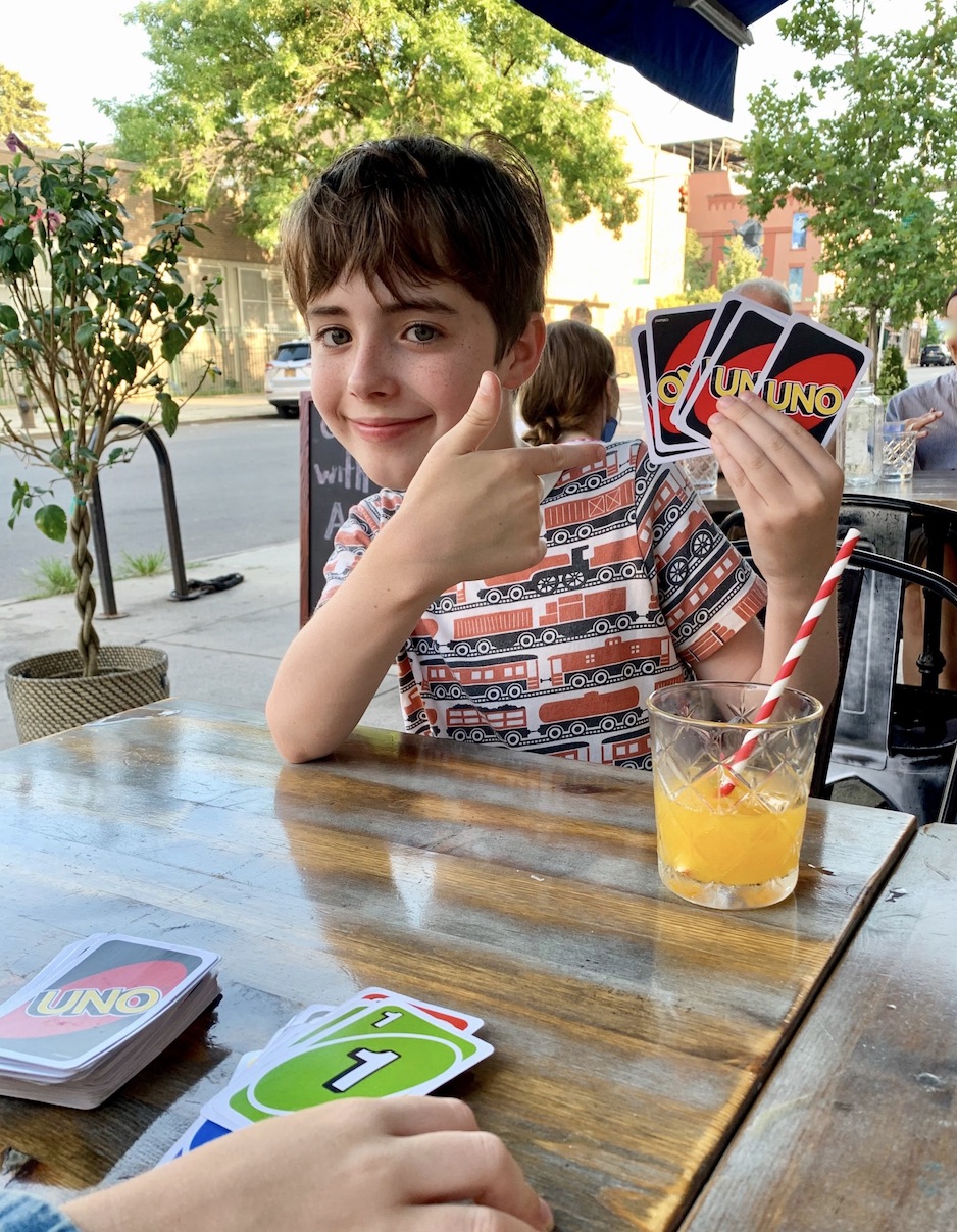First, here’s one of ours: Before dinners at restaurants, we always play a game of Uno. We’ll usually play it at home beforehand, or in a hotel lobby if we’re on vacation, but sometimes we’ll play it at the table before the food arrives. The game is often accompanied by wine for the grownups and juice (or Shirley Temples) for the kids. It’s such a fun ritual and helps set a relaxed tone for a family dinner out. That’s all, short and sweet!