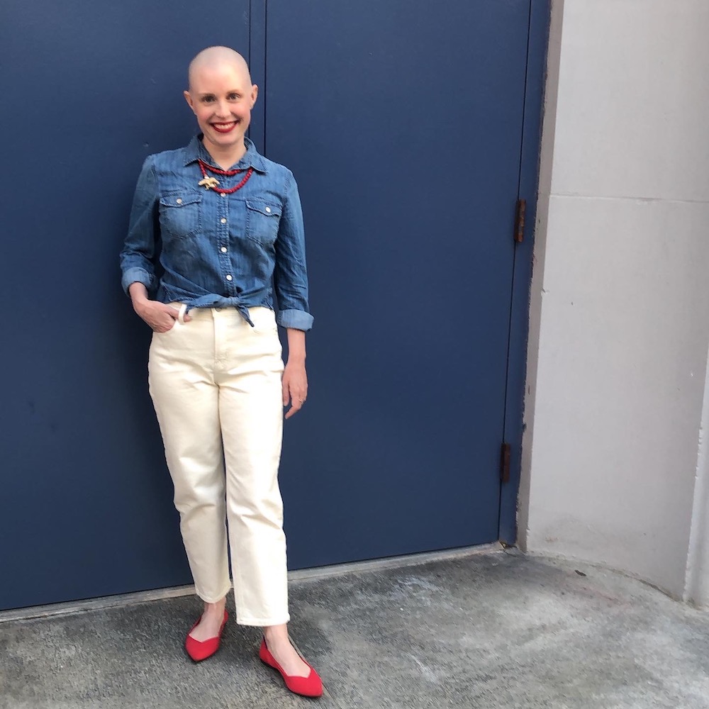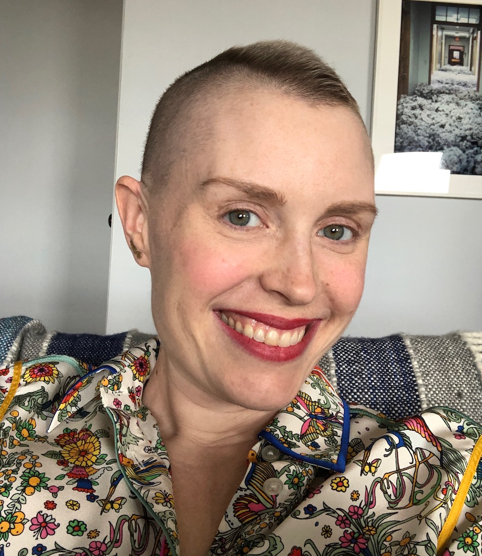 My aunt cuts hair, so she came over and gave me a cute pixie cut in my kitchen. When the pixie started to fall out, my husband shaved my head in the shower. When you save your head, it does feel like taking some of the power back. I felt a lot like G.I. Jane. I kept rubbing my head like, wow, this is kinda badass. One thing everyone says to you when you’re bald is, ‘You have such a good head shape!’ And I’m like, it’s a head. They’re all good. Everyone has a great shaped head!
