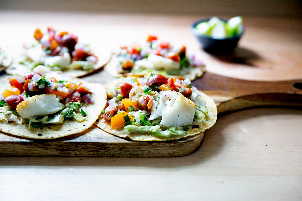 All his best-known tacos are in the cookbook — beer battered fish, blackened salmon, Baja, jackfruit, mushroom asada, even a Mexi-Falafel take. I started simple, though, with this classic fish, which calls for pan-fried cod and a bright slaw. So easy. So good.