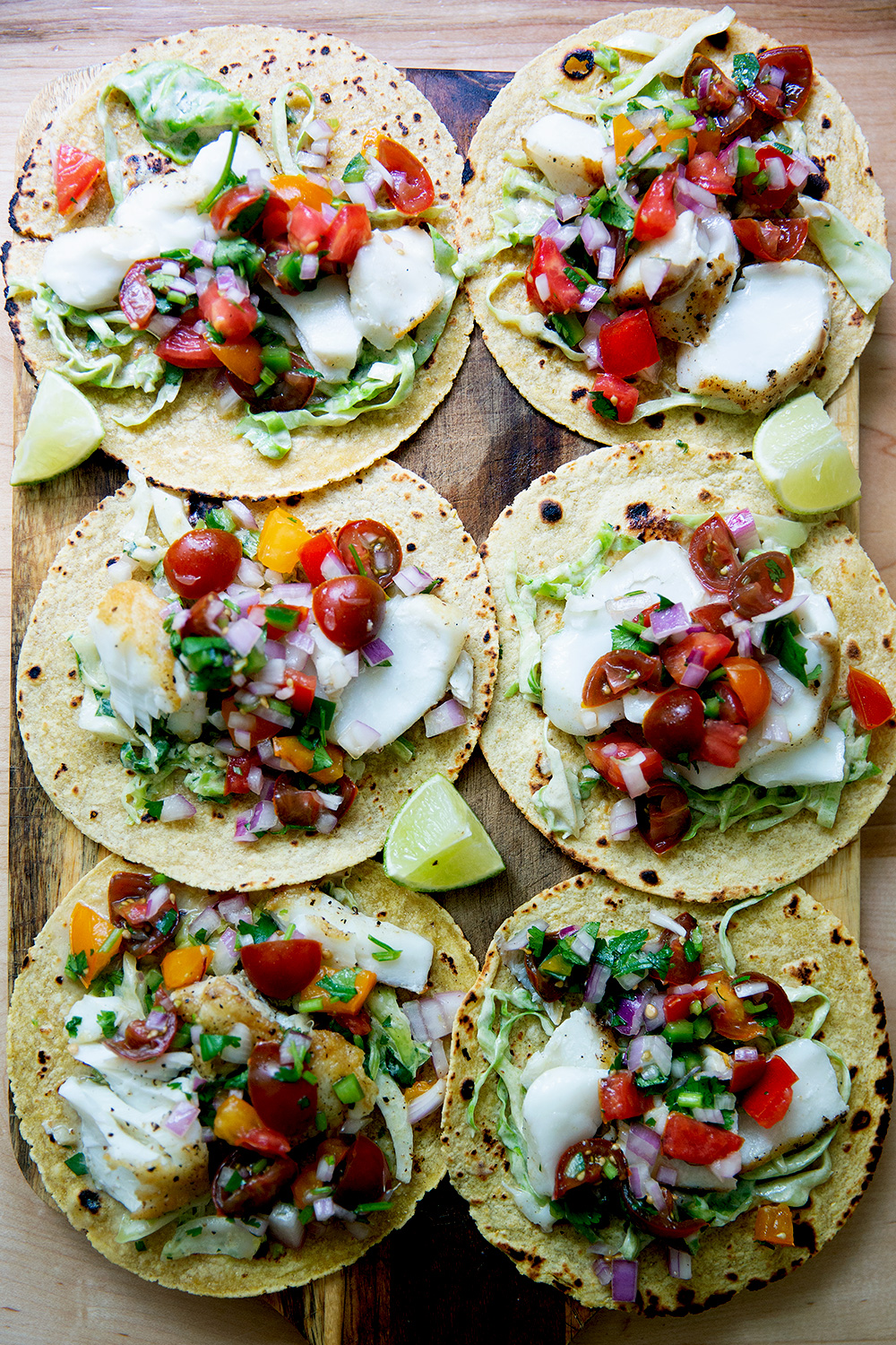 Preheat the oven to 250°F. Stack the tortillas, wrap them in aluminum foil, place them in the oven, and let them warm, 15 minutes. Remove from the oven and line up the tortillas assembly-line-style, on your work surface. Place a dollop of the slaw mixture on each tortilla, then fish, then Pico de Gallo.