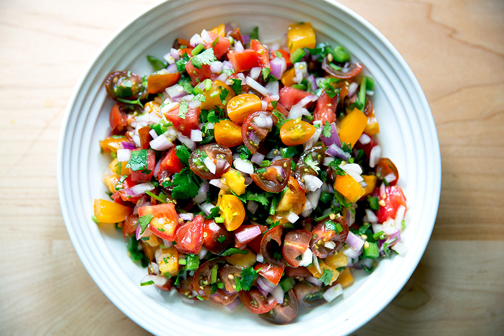 In a medium bowl, combine 2 ripe tomatoes (cored, diced), 1/2 small red onion (diced), 1/2 small white onion (diced), 2 jalapeños (halved, seeded, ribs removed, diced), 1/4 cup chopped fresh cilantro, juice of 1 lime, 1 tablespoon olive oil, 1 teaspoon kosher salt.