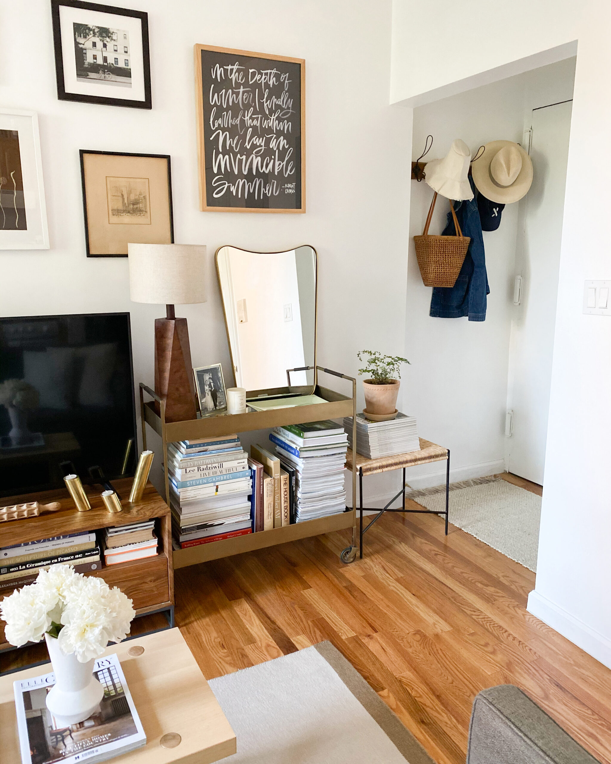 Bar cart: Crate & Barrel. Mirror: Renwil. TV console: CB2. Coat rack: One Kings Lane. Botanical print: Liz Libré. New York poster: similar. Striped shirt artwork: Chance x Mary Matson. Other art: mostly vintage.