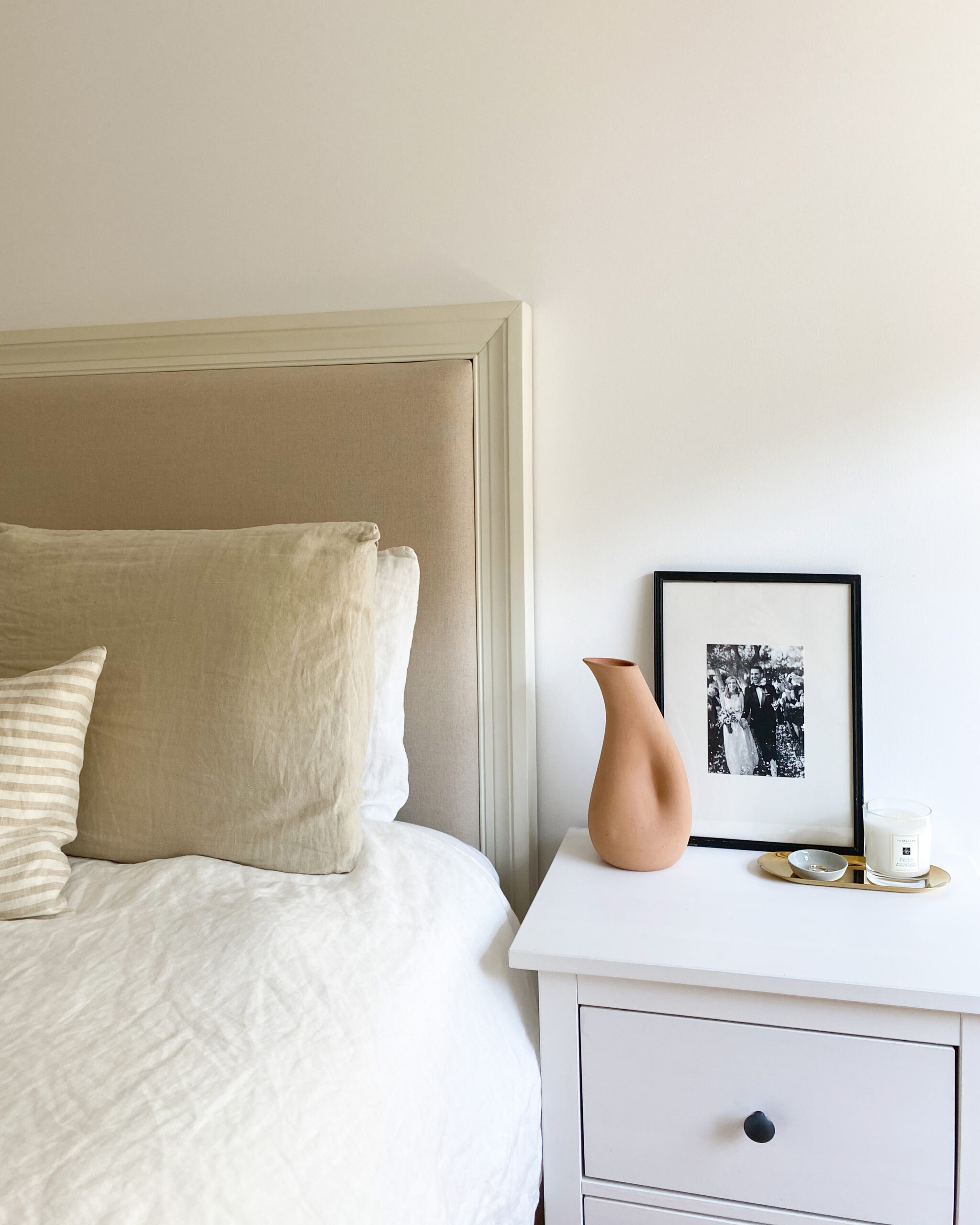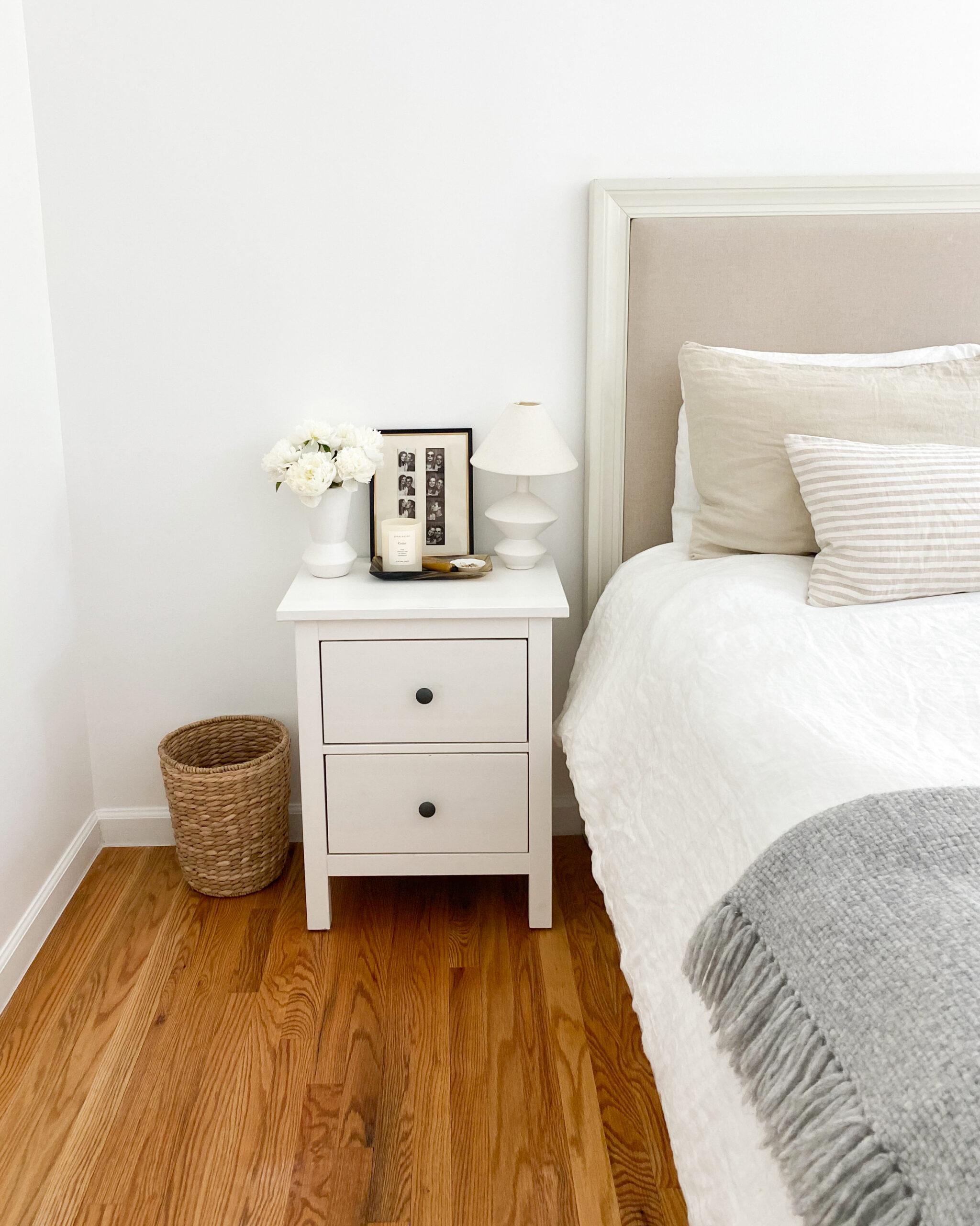 Storage bed and headboard: Pottery Barn. Bedding: Parachute. Bedside tables: IKEA Hemnes.