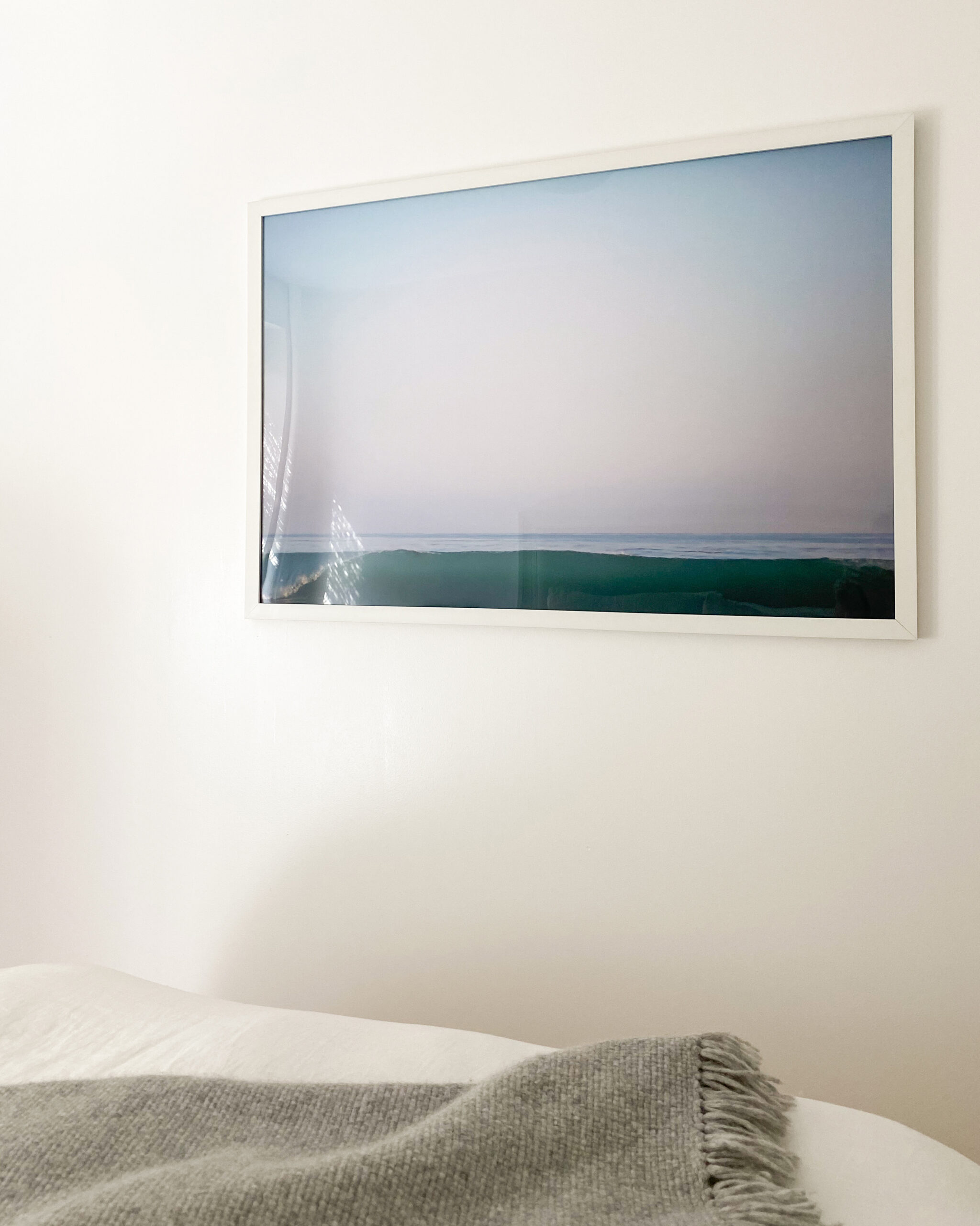 On relaxing artwork: This print of California is by Max Wanger. We can lie in bed and have an ocean view.