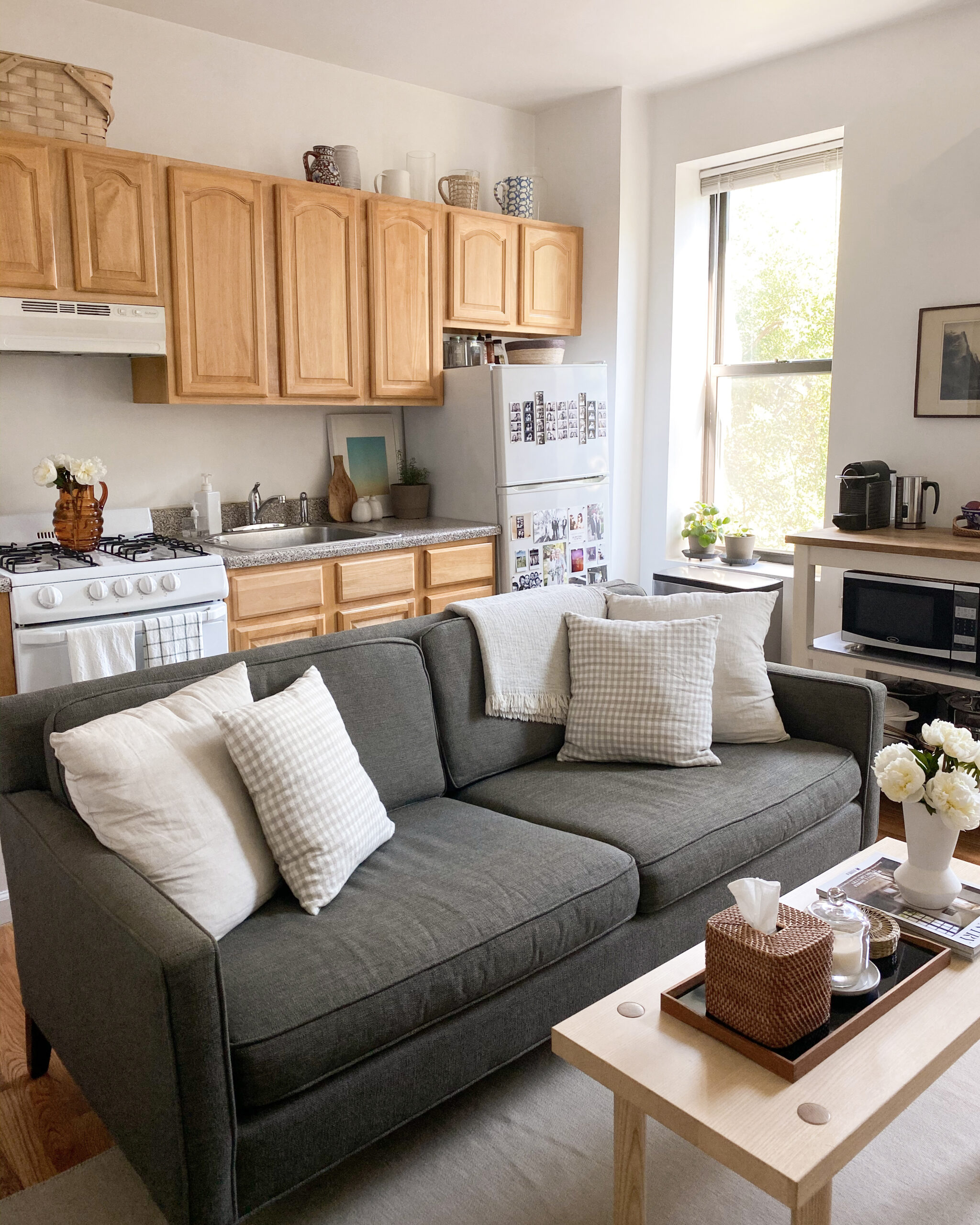 Sofa: Crate & Barrel, similar. Plain pillows: Parachute Home. Gingham pillows: Zara Home. Rug: Nordic Knots.