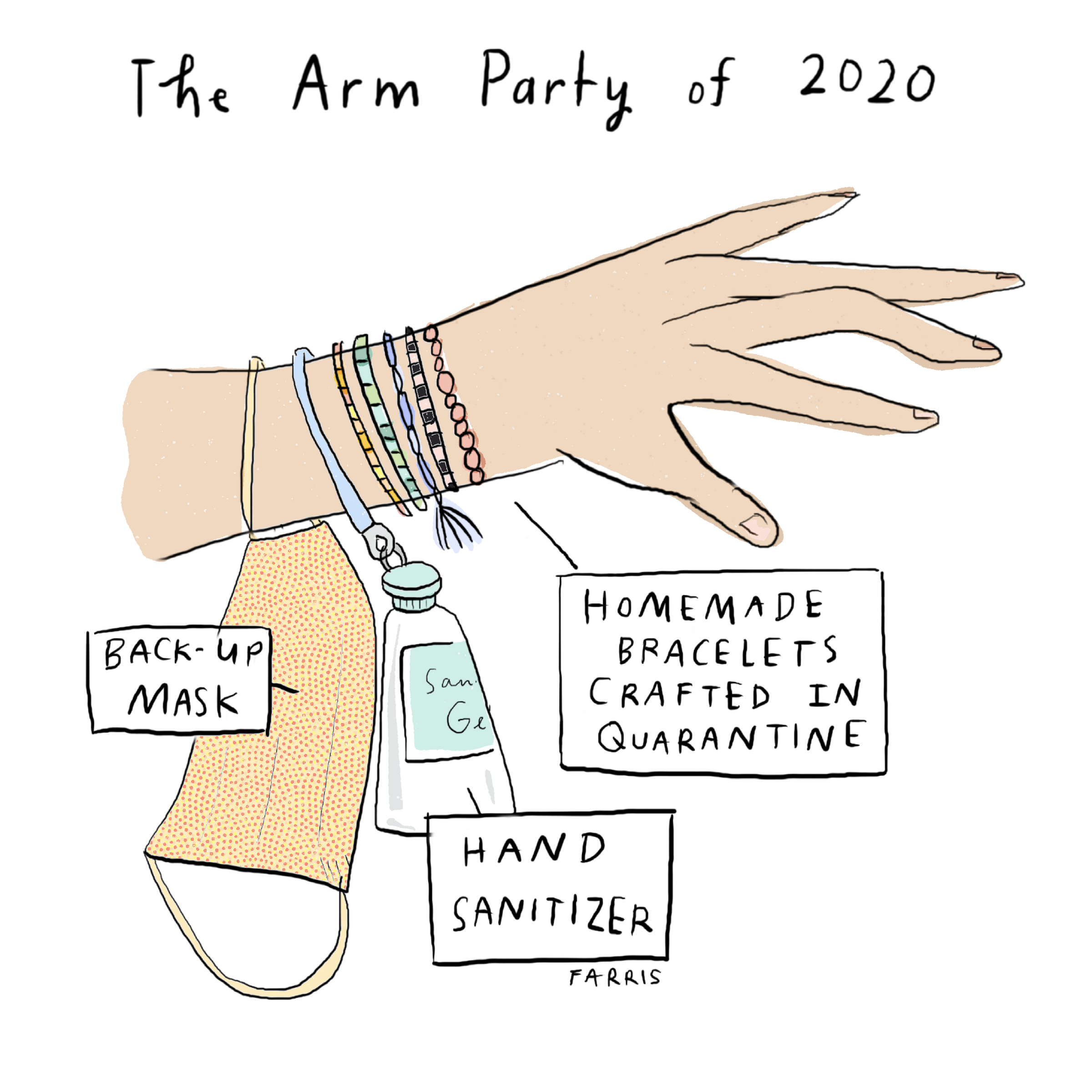 None of it. My hand sanitizer is in my purse, extra masks are there as well, and I have never been crafty enough to make my own bracelets.