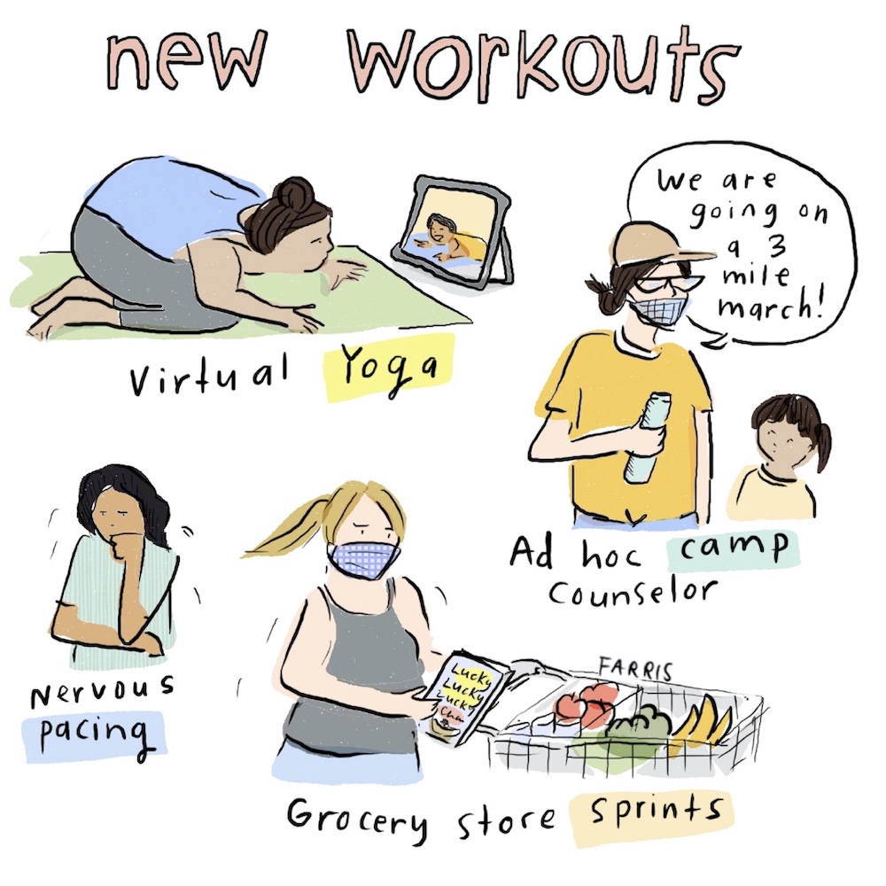 The virtual yoga illustration made me laugh out loud. I’ve been doing virtual yoga and Nia Dance through Zoom since the beginning of quarantine, and I can completely relate to being in an awkward position while trying to follow the teacher on the screen. Very Zen haha.