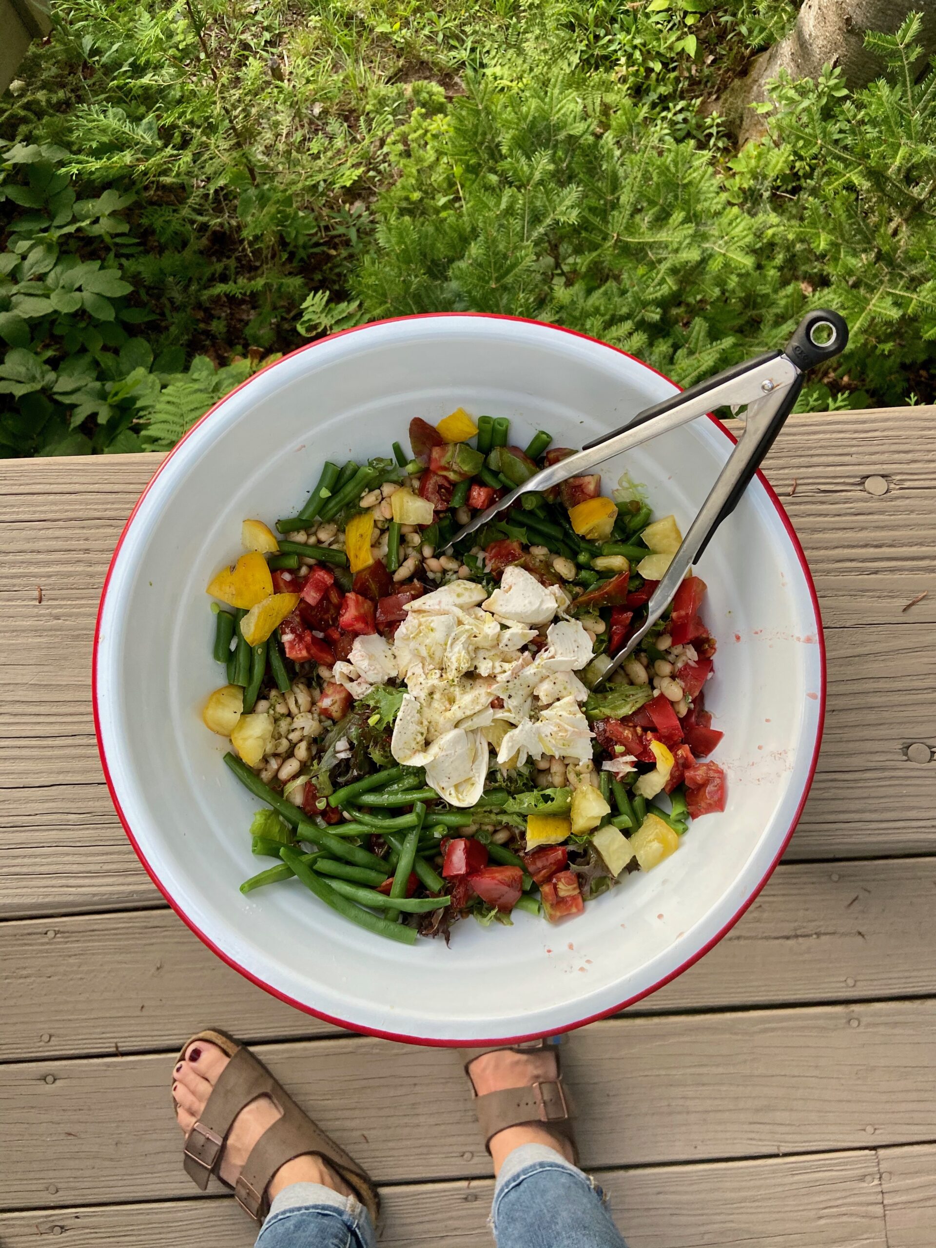 This was green beans, yellow and red tomatoes, marinated white beans (1 14-ounce can white beans, rinsed and drained, then marinated in olive oil, red wine vinegar, salt, pepper, and fresh basil for an hour), and some torn fresh mozzarella…
