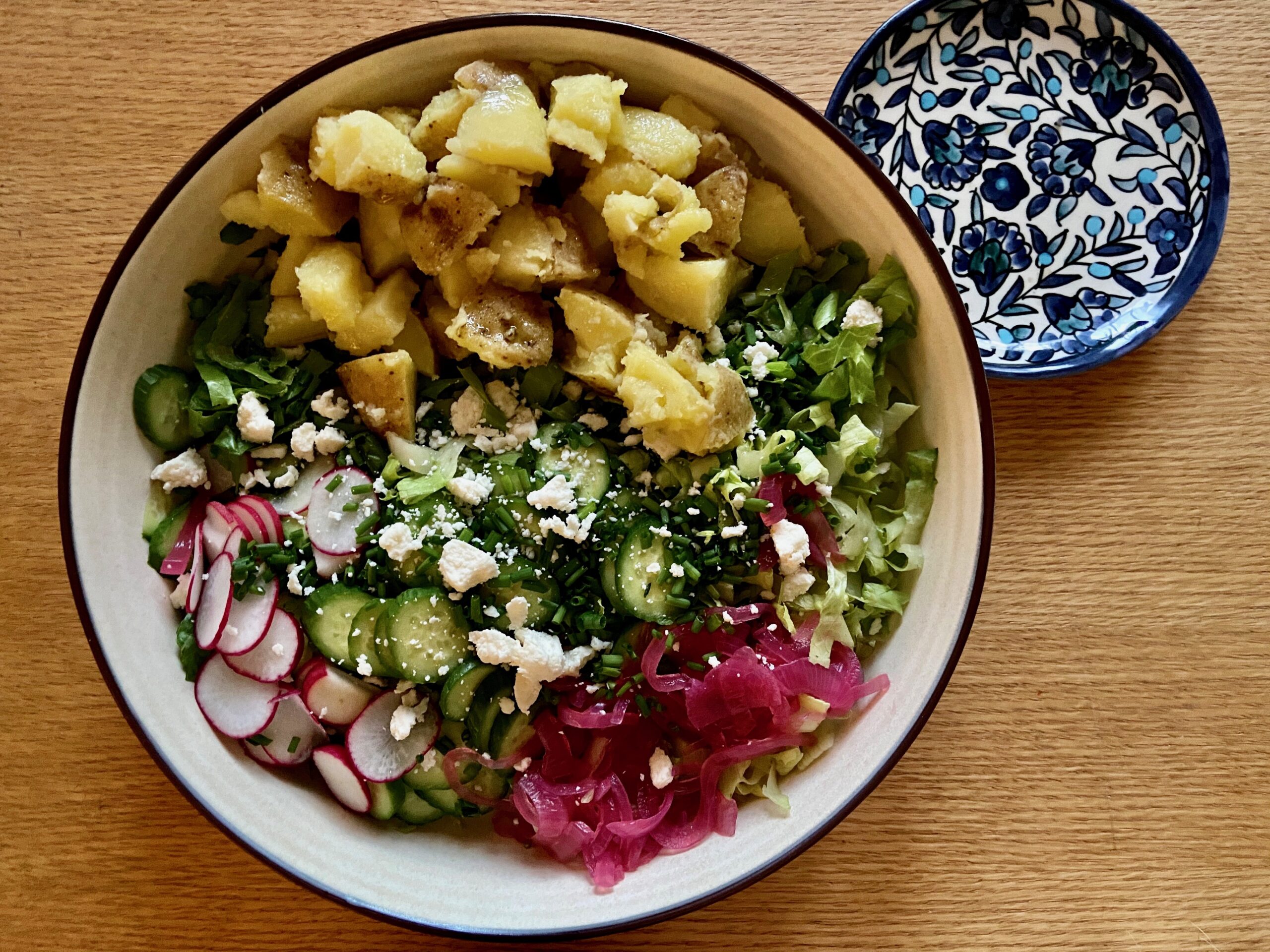 …This one was a little more substantial: Radishes, pickled onions, shredded lettuce, feta, cucumbers, then boiled potatoes that I tossed with a little olive oil and lemon juice while they were still warm. (Why do I not always do that?) Not shown: Grilled steak splayed across the top! With so much veg action in the salad, though, we only needed to add a small amount of meat — less than a pound of a strip for four of us, sliced on the bias to be precise. Grilled chicken would be great here, too.