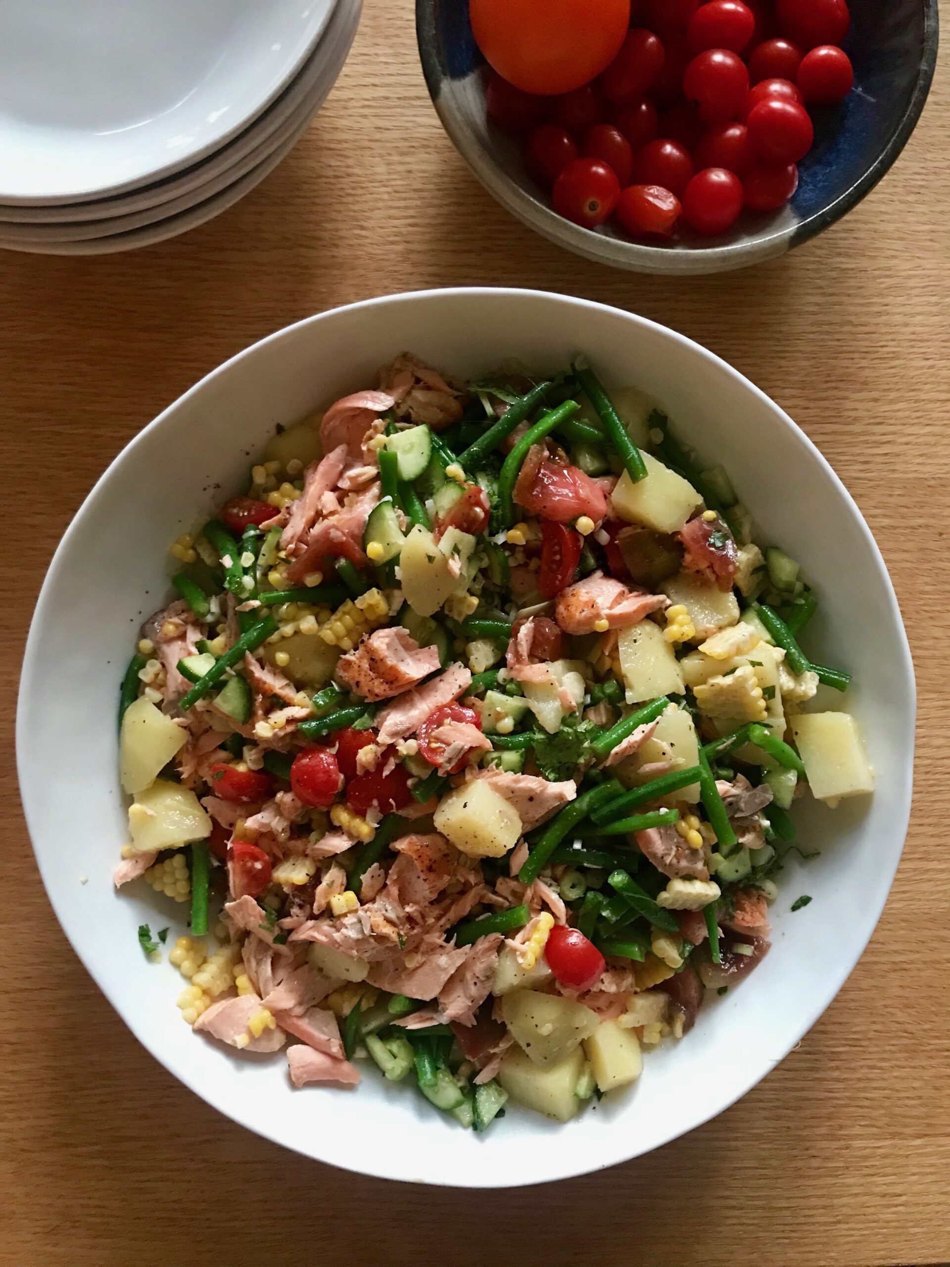 And anyone who has known me for even a minute knows that no summer salad post would be complete without our Salmon Salad. It is by far the most popular dinner in my house. My daughter is leaving for college next week and I’ll bet you can guess what she requested for her send-off meal?