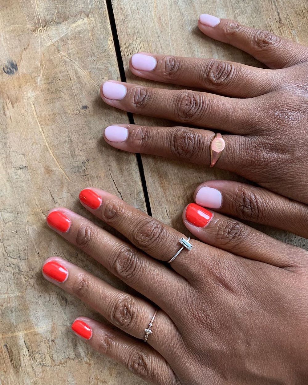 A little over a year ago, I saw an image from a photo shoot with red nails and light pink nails. I tried it once and now it’s become my thing. I mix it up with different shades and colors for different seasons, and just whatever I think will look fun. It’s a good way to take your regular manicure to the next level and create a color story!