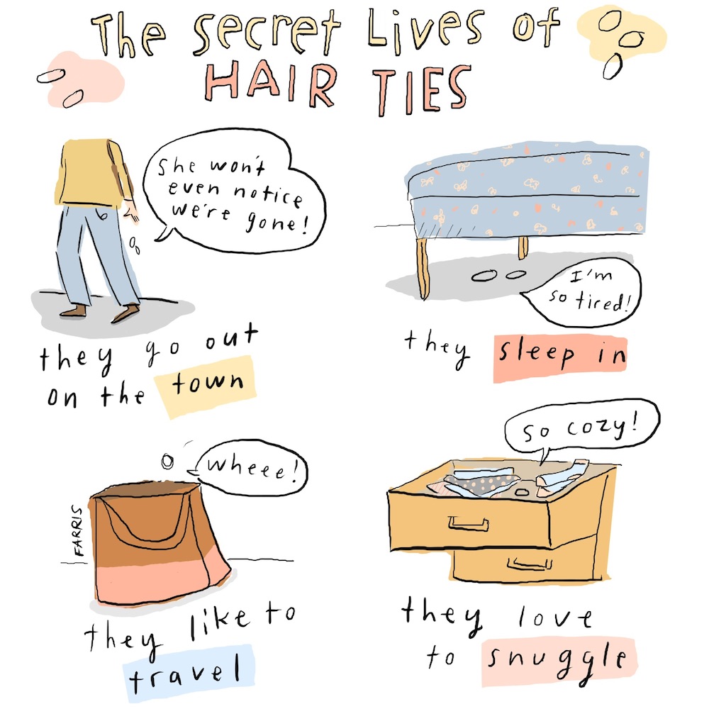 When I encounter a hair tie on the street during my walks, I like to invent a little backstory as to how it came to be and who wore it.