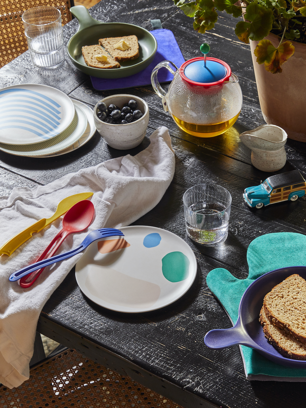 Sowaca Pan, HAY pot holder, Gio Line glasses, Bamboo dessert plates, Bodum tea pot, Klikk on-the-go cutlery, HAY oven mitt.