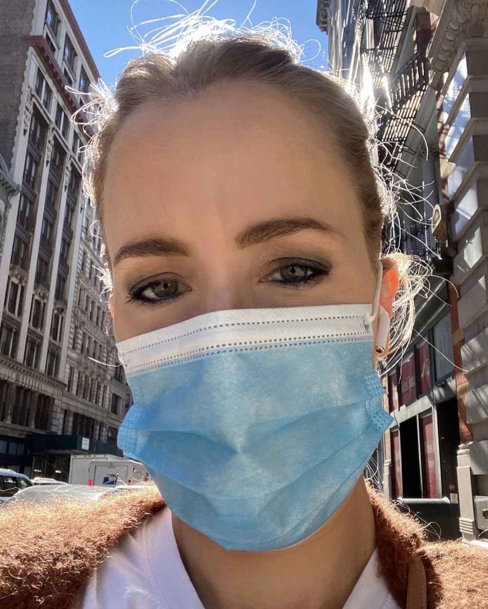 Line your eyes with navy eyeliner. “It’s very flattering and surprising,” she says. “And it makes the whites of your eyes look whiter.” Plus, while wearing masks, you look people right in the eye, and navy liner is a way to make them pop. “Every time I pee and wash my hands I’m like, look at you.”