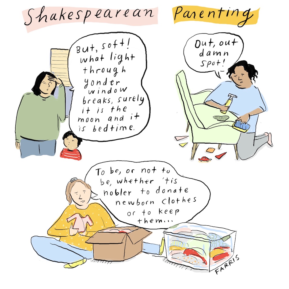 This might be my favorite Grace Farris cartoon ever! I have been thinking a lot about The Taming of the Shrew as I spend days with my toddler. (Nerd out English major moment here.) She is obsessed with the moon, and she insists everything (the sun, big streetlamps, neighbors’ porch lights) is the moon. Some days I have the time/energy to explain it to her, but on certain days there’s no point trying to convince her otherwise. On those days, I find myself thinking of this exchange: KATHERINE: The moon?! The sun; it is not moonlight now. PETRUCHIO: I say it is the moon that shines so bright. KATHERINE: I know it is the sun that shines so bright…HORTENSIO: Say as he says, or we shall never go.
