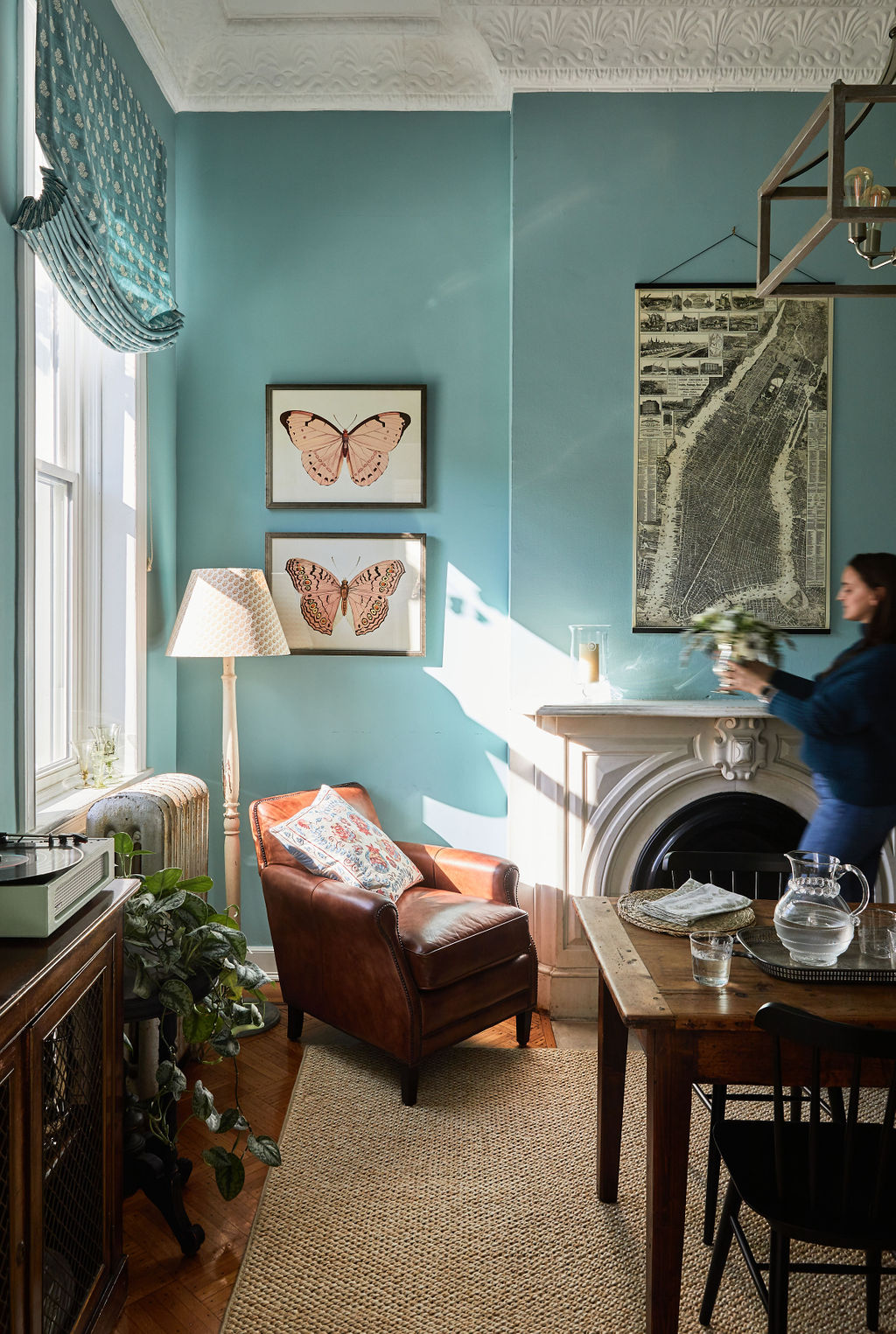 Paint color: Kensington Green by Benjamin Moore. Butterfly prints: Chairish. Map print: vintage, similar. Leather chair: vintage from Lodestone Home. Throw pillow: vintage, similar. Dining table: vintage from Craigslist. Dining chairs: Serena and Lily. Black floor lamp: Lamps Plus. Rug: Ballard Designs, similar.