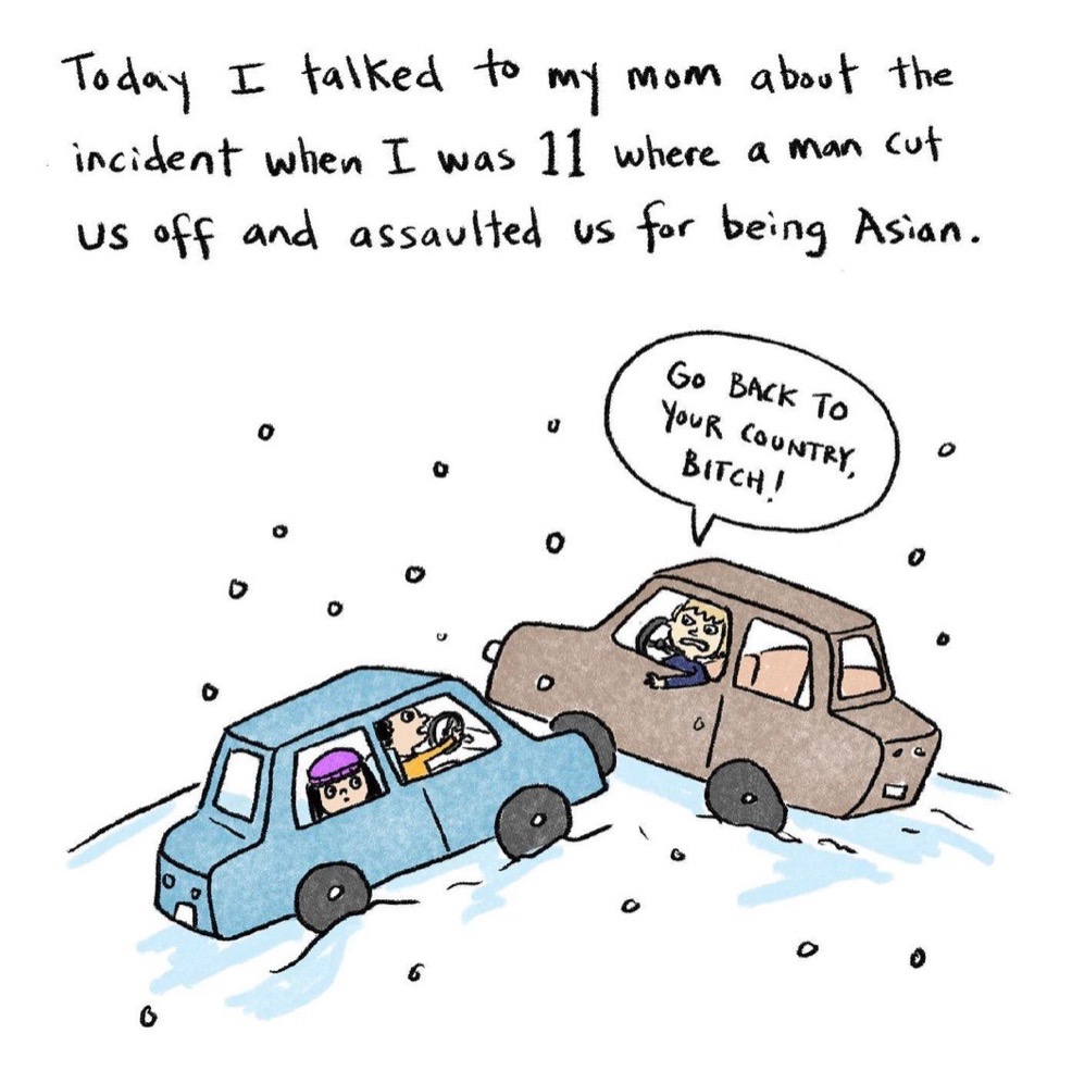 The most recent ones are about anti-Asian racism — obviously there’s this huge uptick in violence against Asians, and it’s pretty upsetting. I was thinking about being Asian-American or Asian-Canadian and how every one of us has had negative experiences. I was thinking about how it’s still important to tell these stories, even if they’re not these huge epic awful stories — but instead the everyday things that happen. Part of why I started this series was I wanted to share my experiences so that other would share theirs. I also wanted non-Asians to understand what microaggressions really mean and what they might feel like. When I made the first one, I was super depressed for two days and didn’t realize why. It really triggered something in me — that feeling of not being seen or of being assumed to be a certain kind of person.