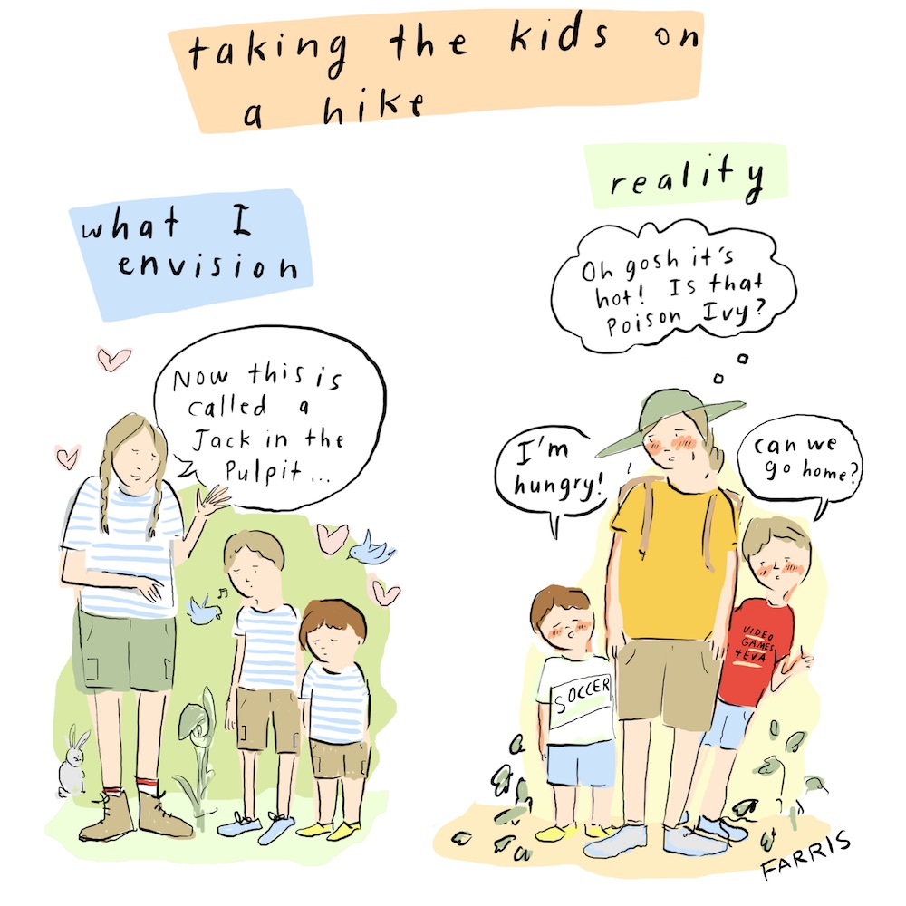 This is spot on!! My husband and I are/were both outdoorsy with dreams of raising crunchy granola kids who lived for hikes and days spent appreciating the natural environment around us. At 9 and 12, not so much. We carried them in baby backpacks, we introduced them to the woods early, we packed special snacks and backpacks…..now the suggestion of a walk in the woods is met with shoulder shrugs. It is a bit disheartening, but I am confident their love for the great outdoors will return. We live in very flat mid-Michigan and a few years back, while vacationing and hiking along the Appalachian Trail in New Hampshire, an older woman, sprinted past us on the trail while we took our 10000th break and my kids were slumped over in apparent agony. She looked at them, laughed, and then at us and said, “Don’t worry, they’ll come back to you and be beating you to the summit in no time!” I hang on to that thought, when they try to convince me “Animal Crossing” counts as outside time.