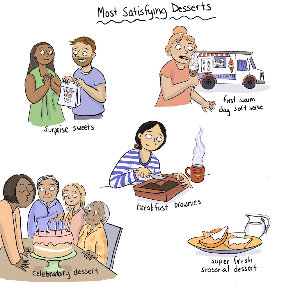 Yes to all of these! I would expand on the “breakfast brownies” and say any leftover dessert for/with breakfast. And, spontaneously replacing lunch with a bowl (or two) of ice cream. Also, an unplanned weeknight dessert that you suddenly realize you have the time and ingredients to pull off.