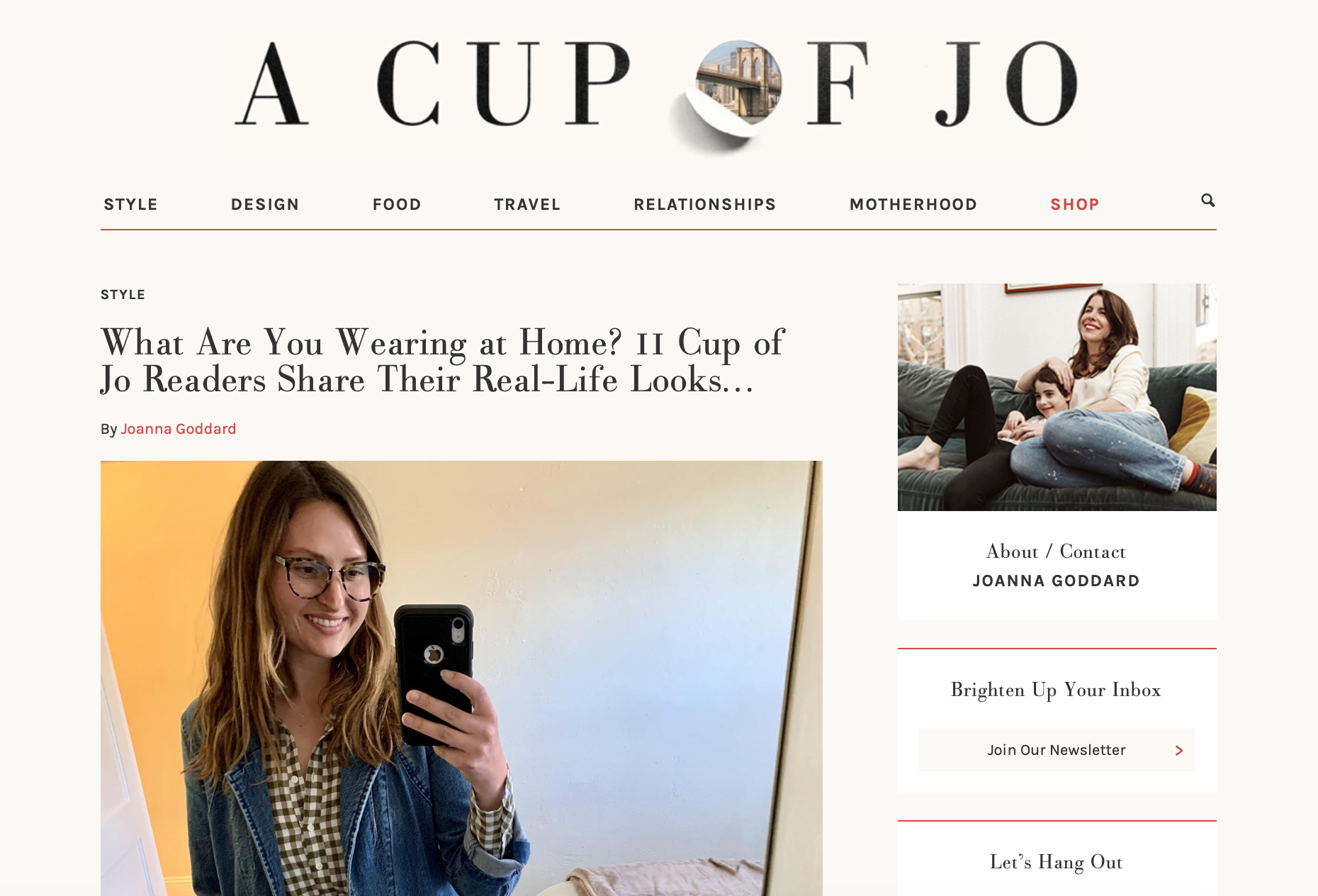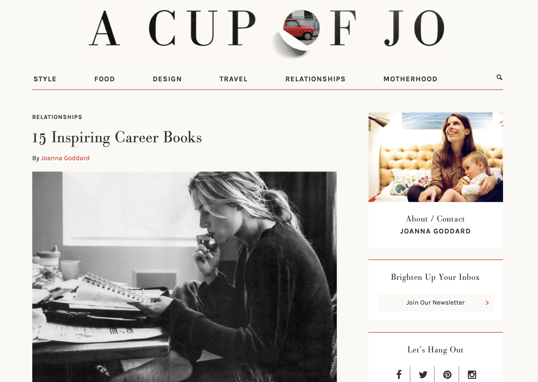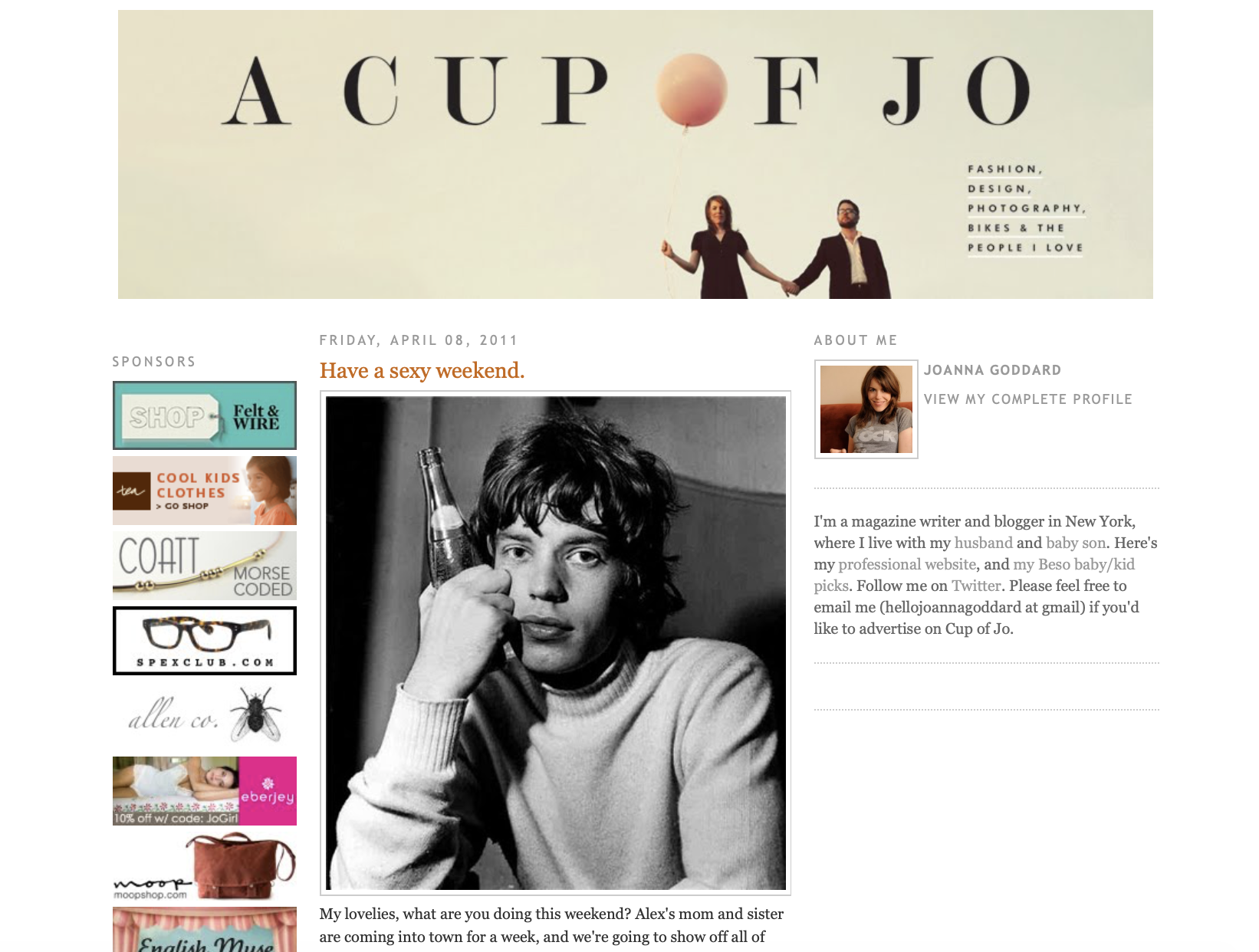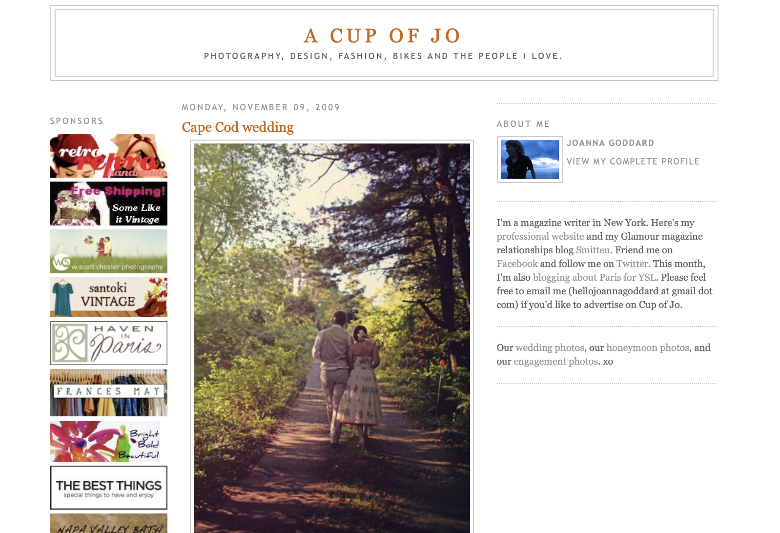 When I decided to play around with blogging in 2007, my younger brother set up a blogspot name and randomly called it “Cup of Jo.” My career was in magazines but I thought it would be fun to mess around on nights and weekends. (Also, I had just broken up with a long-time boyfriend and needed a distraction from eating chips on the sofa and texting him from my flip phone.)
