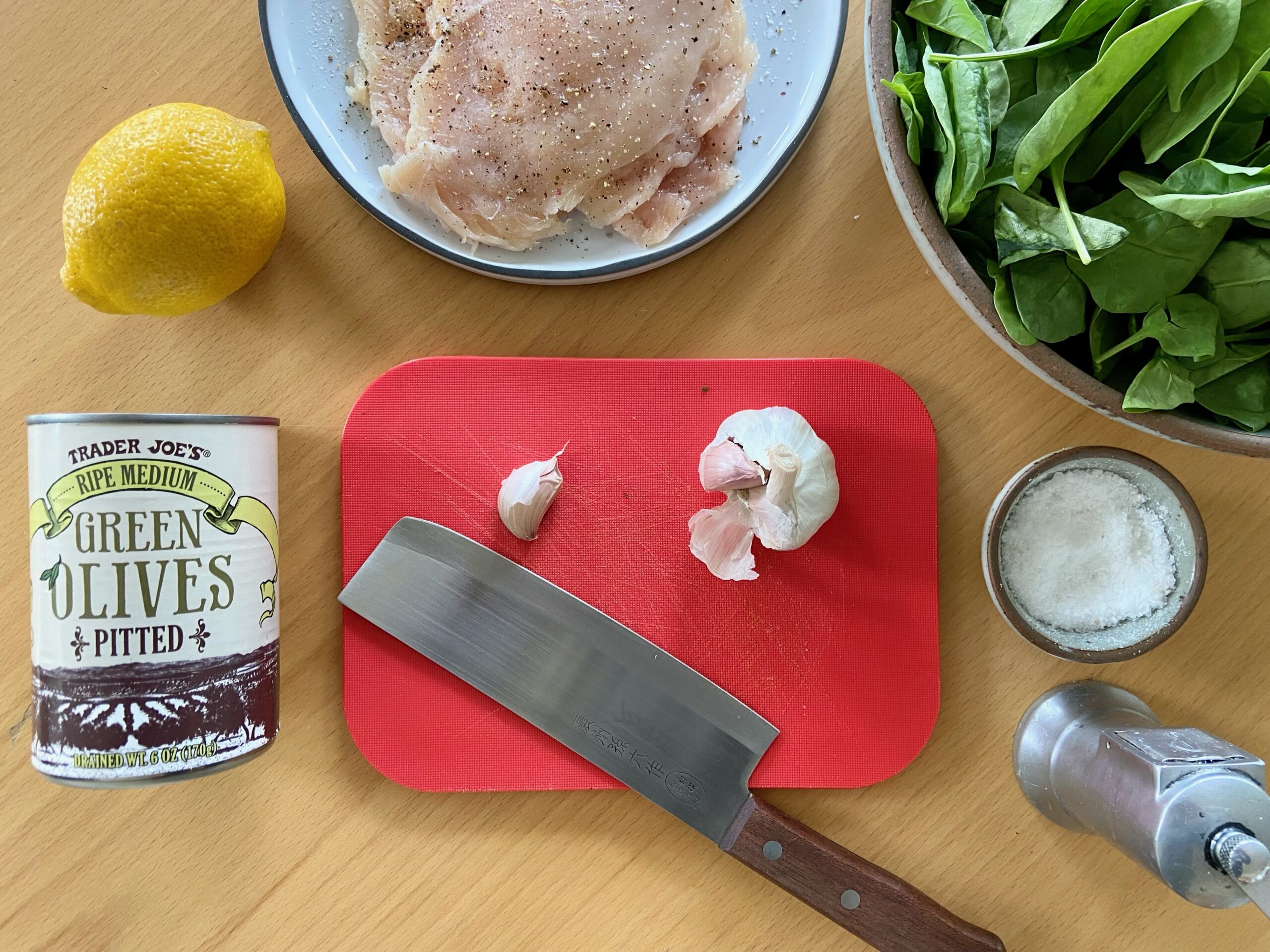To begin with, look how hard each ingredient is working to earn its place. The lemon is on double-duty — offering both zest for the tapenade and juice for the spinach. The green olives immediately dispel any argument against a chicken breast dinner being flavorless, lending a maximum amount of bang-for-the-buck, flavor-wise. (“My husband, who says boneless skinless breasts are boring, actually likes this dinner,” says Arielle.) And by using the same grill pan to cook both the chicken and the spinach, she’s not only saving herself a big-ticket item to clean up, she’s taking advantage of any chicken bits and fat left in the pan to flavor the spinach.