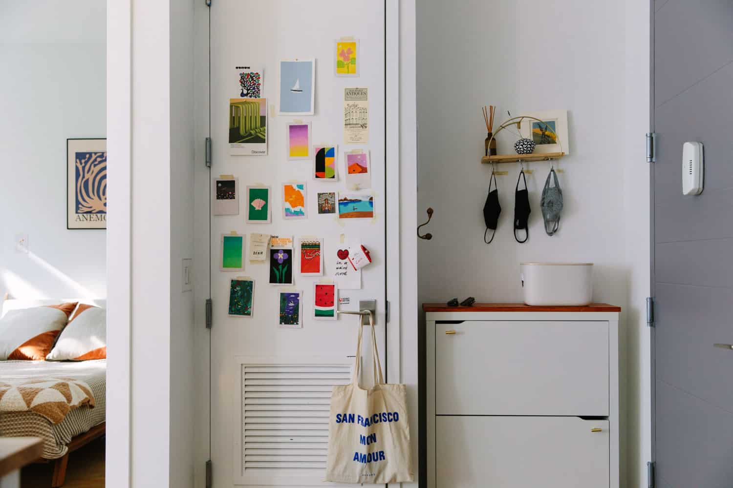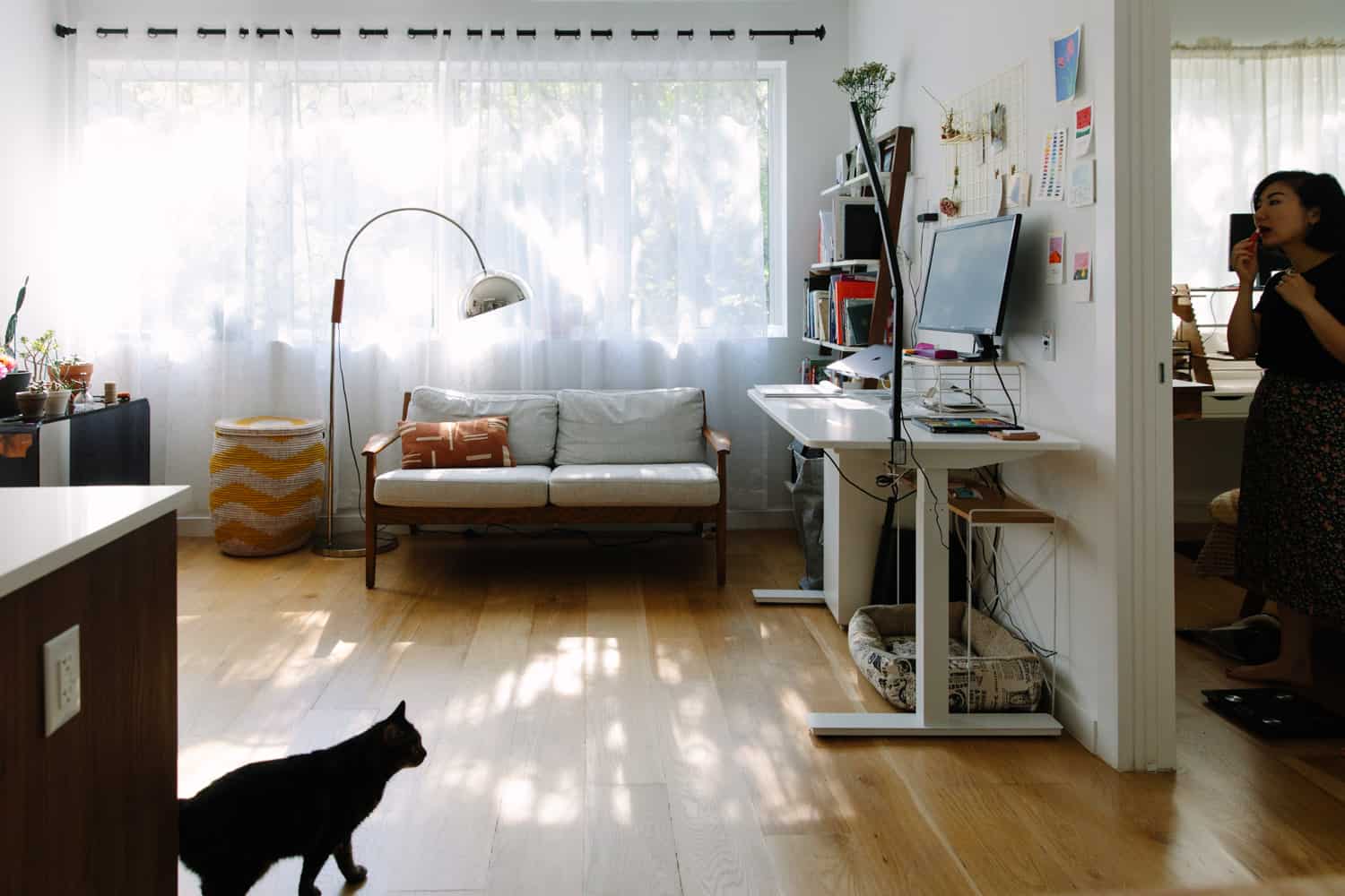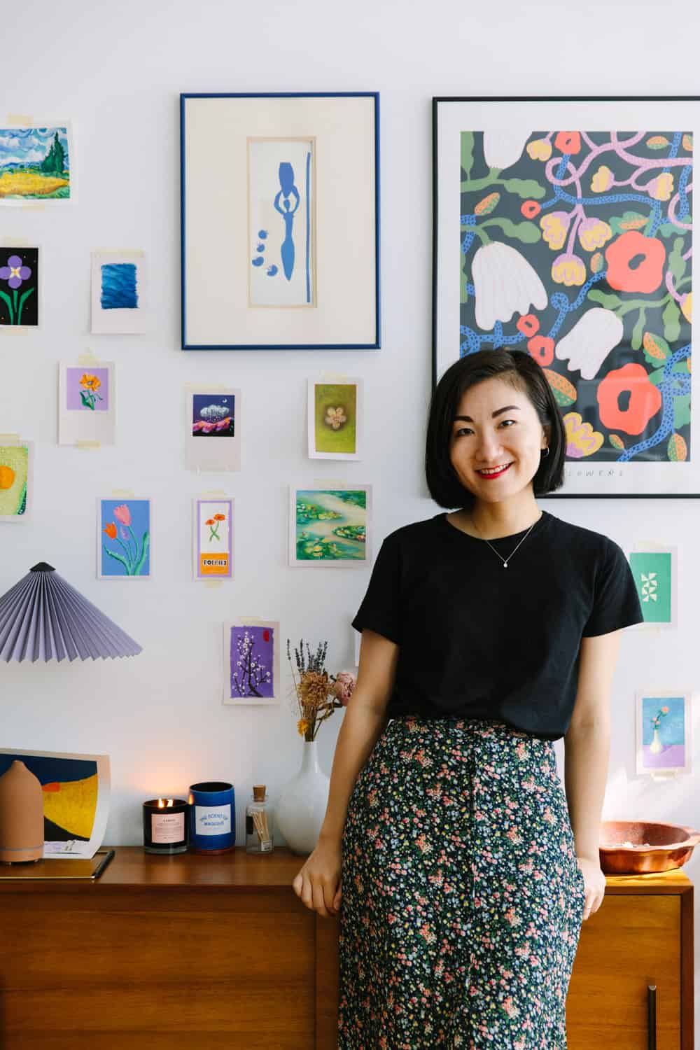 Ariel Sun lives with her husband, Simon, and their cat, Mochi, in Prospect Heights, Brooklyn. Her day job is on a tech company’s design team, but during quarantine, she got into painting and created mini masterpieces to hang around their home. How cool is that? Take a look inside…