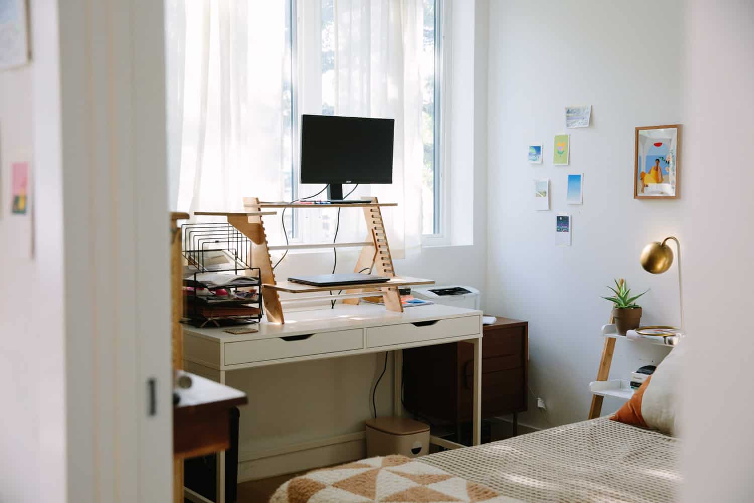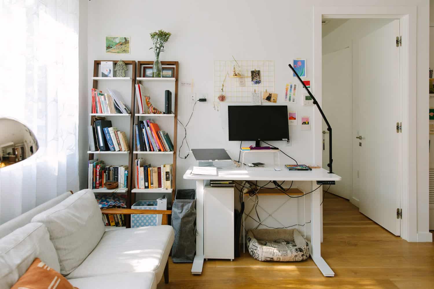 Bookshelf: West Elm. Standing desk: Autonomous. Desk riser: Open Spaces.