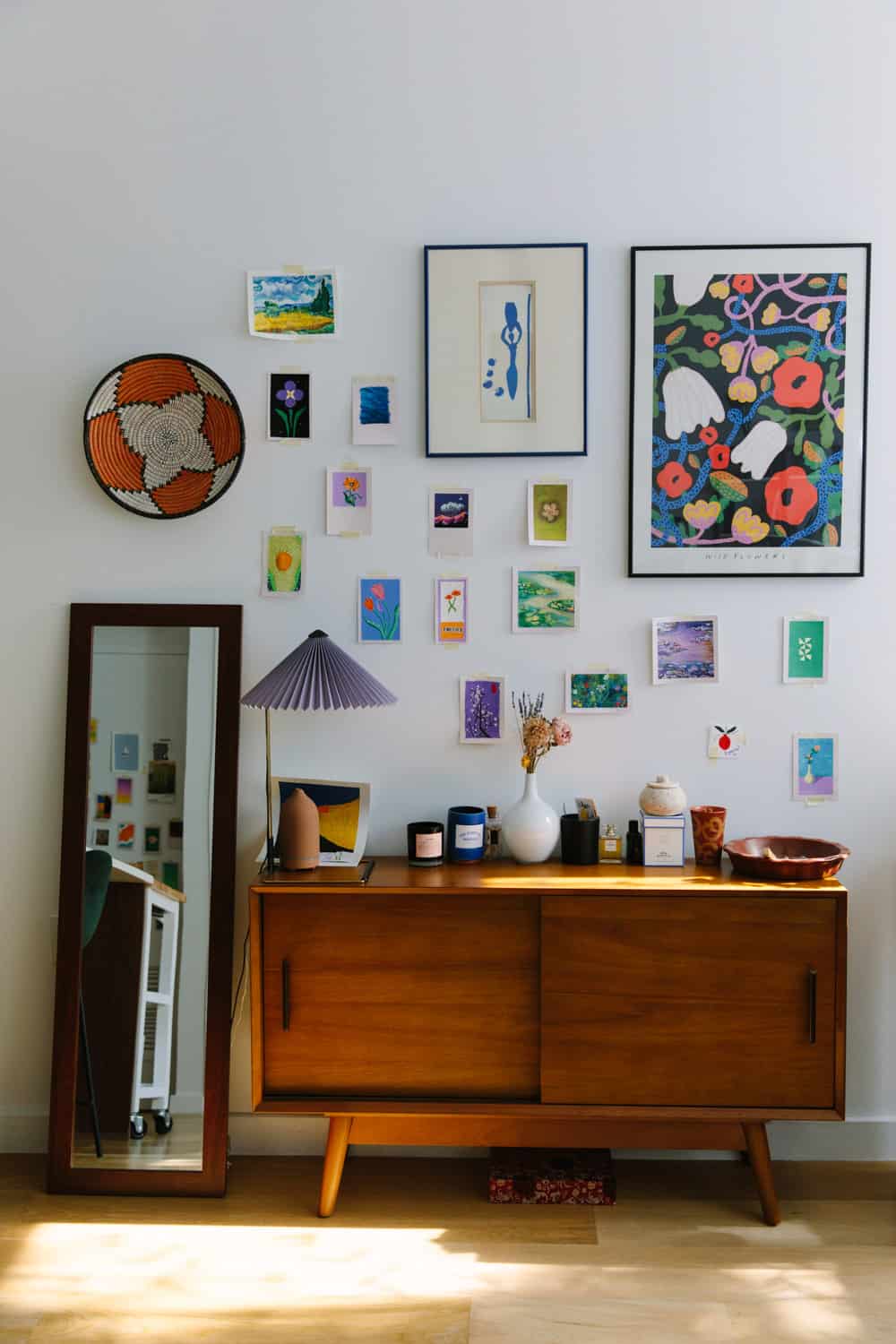 Console: West Elm. Purple lamp: Hay. Diffuser: Virtuvi. Wildflower Print: PSTR Studio.