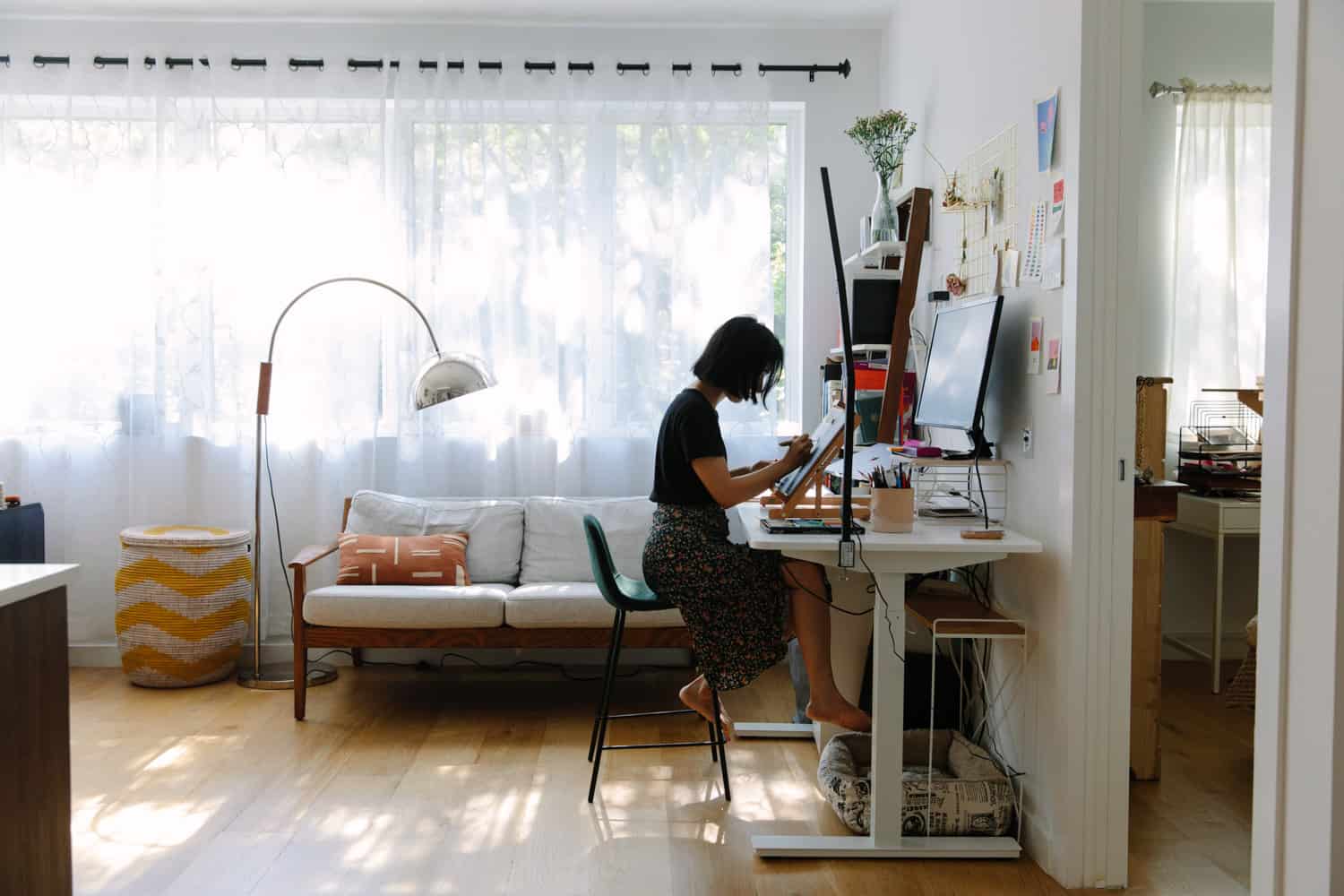 On a standing desk: My height adjustable standing desk helps me carve out a ‘home studio,’ in which I often spend 10+ hours a day. On weekends, I clear out a surface to draw, paint or read.