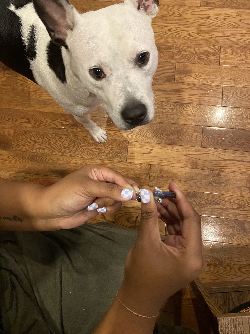 Cute, right? Once I got the nail size I wanted on one hand, I cut and shaped the same size for my opposite hand. (My friend Gabby’s dog, Otto, was a great supervisor.)