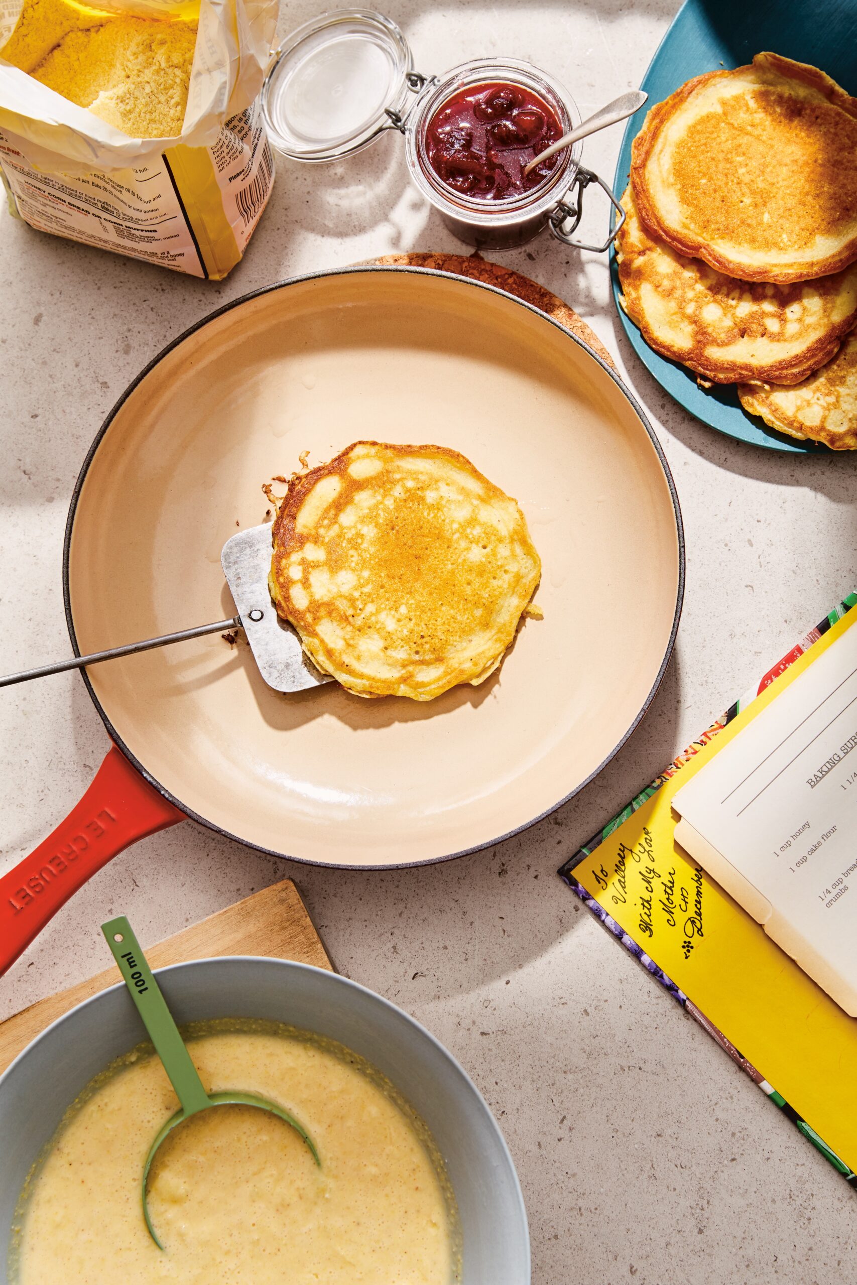 The pancakes have some grit from the cornmeal and crisp edges from the oil they’re looked in. Grandma would use her giant cast-iron skillet, whose heavy bottom ensured that the pancake cooked evenly and all the way through. But a griddle or other skillet will give those results, too. The baking powder gets to work as soon as the wet ingredients are mixed with the dry, so whip up the batter just before you’re ready to get cooking. A pat of butter and some maple syrup are all these pancakes need, and the Cranberry-Maple Syrup pairs with them beautifully.